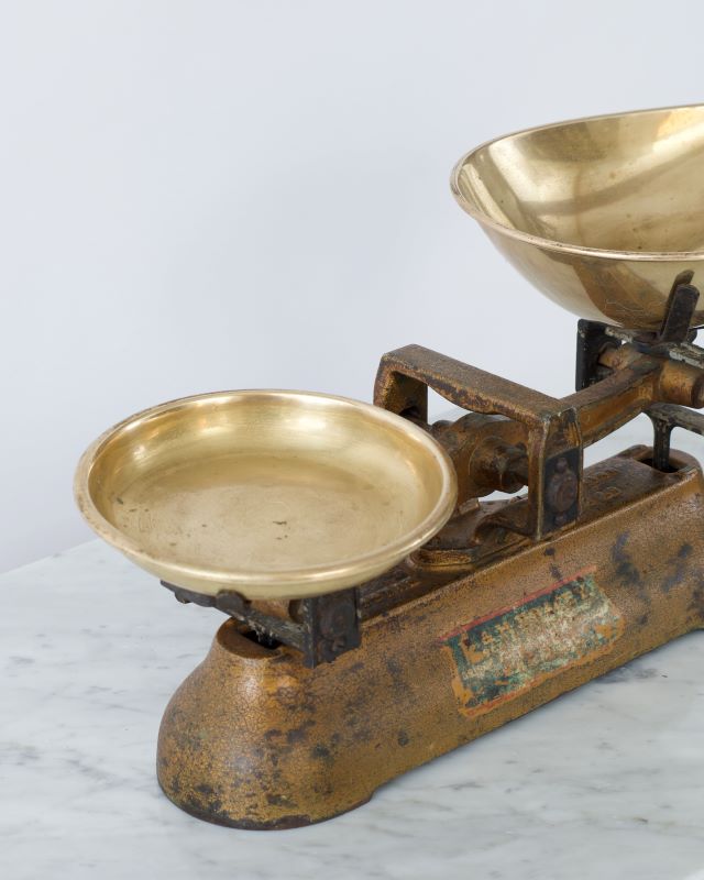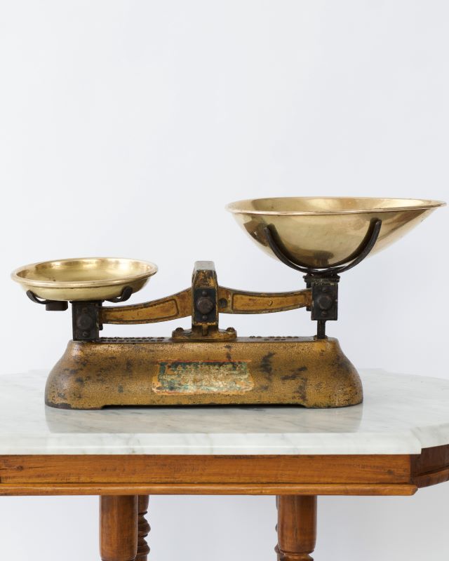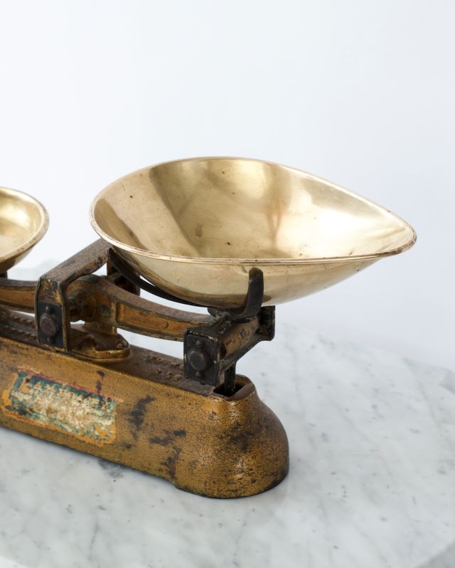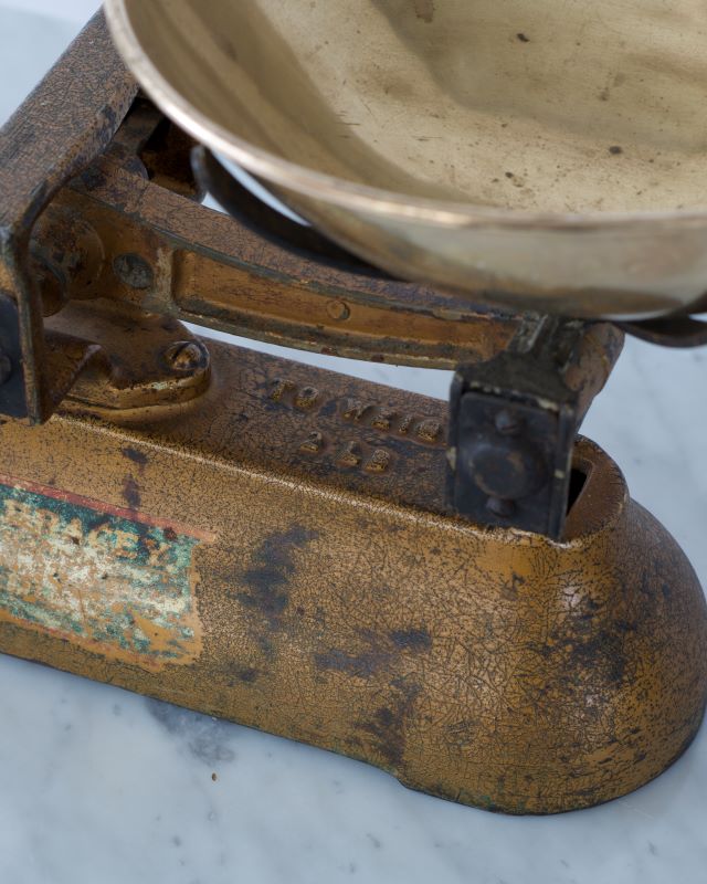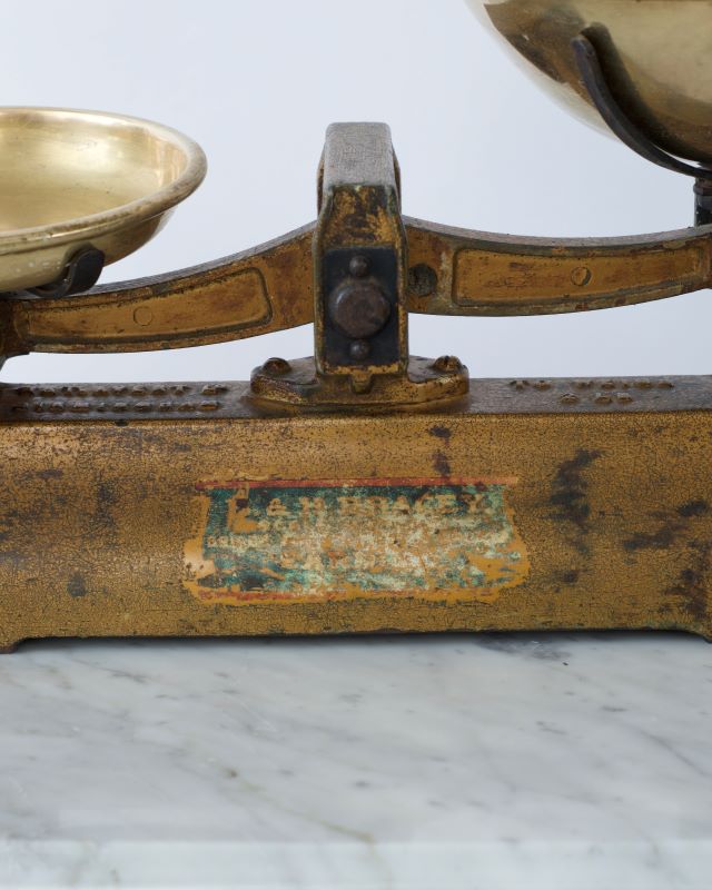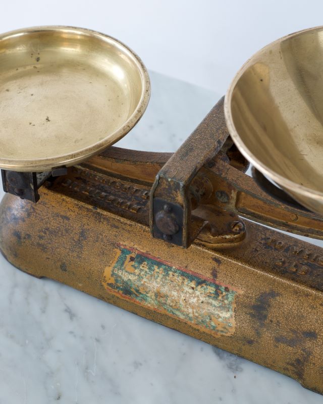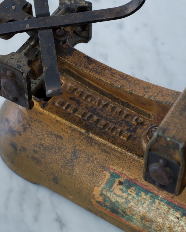 Angielska waga szalkowa W&T Avery Birmingham. Bardzo stara, na podstawie ładna patyna. Anglia, koniec XIX w.