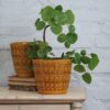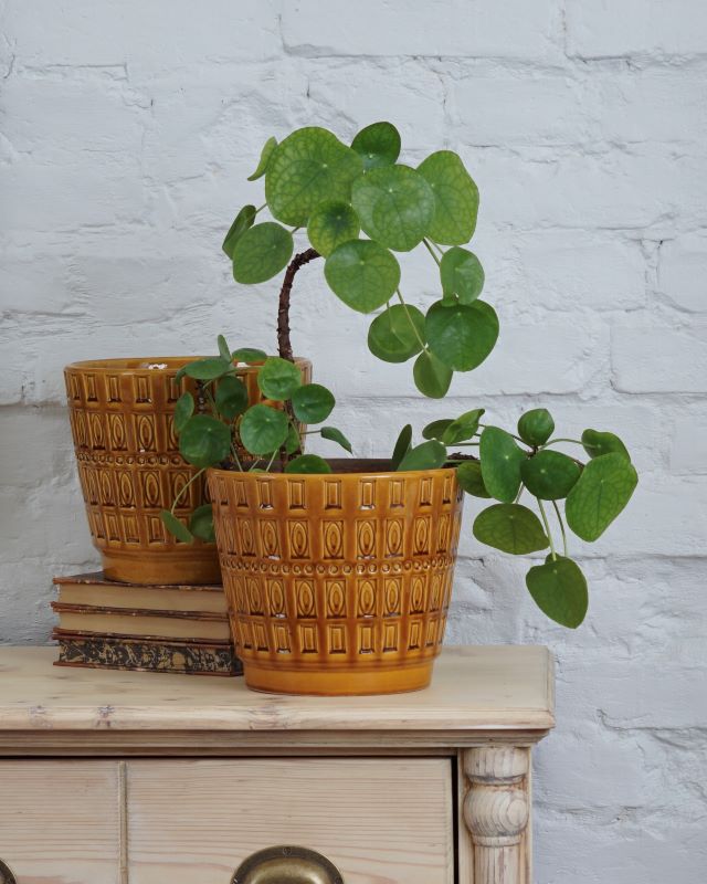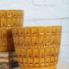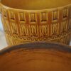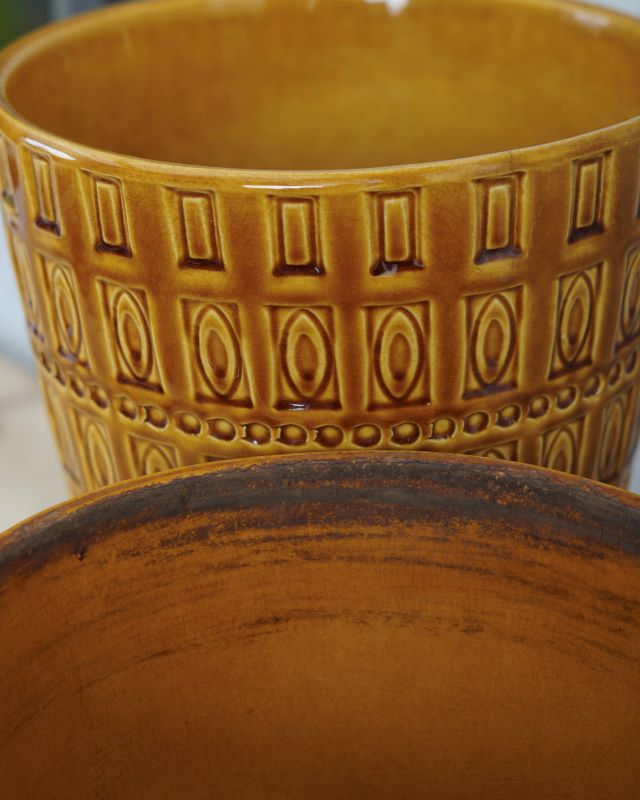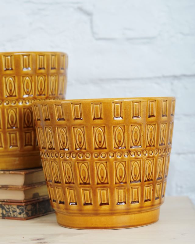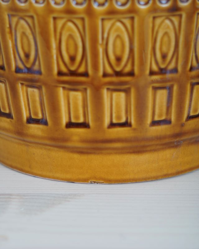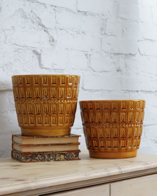 Ceramiczne , duże osłonki na rośliny niemieckiej wytwórni Scheurich – Inka. Brak sygnatur ale bardzo dobrze dokumentuje je internet. Wykonane w stylu fat lava, z reliefową dekoracją o nazwie Inka. Ceramika glazurowana na kolor musztardowo – żółty lub ochry. Niemcy Zachodnie, lata 60-te. Posiadają drobne ślady normalnego użytkowania. Na podstawie jednej z nich wada fabryczna – maleńki ubytek ale zeszkliwiony częściowo.