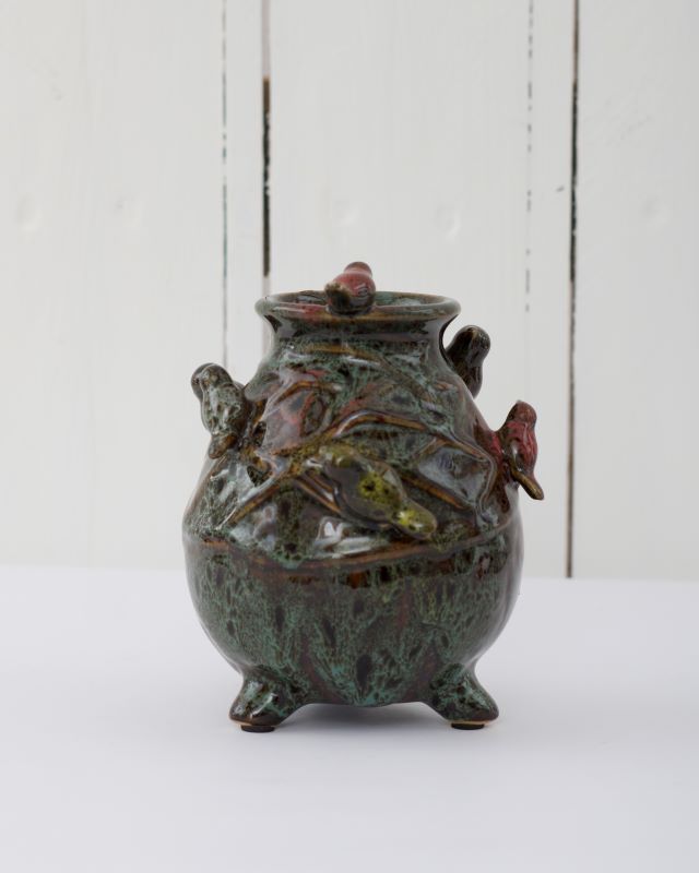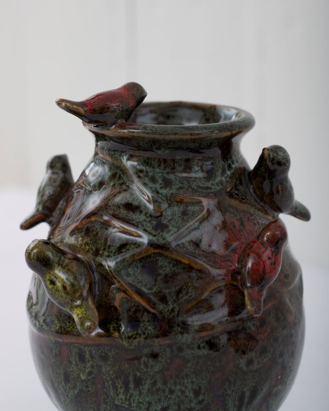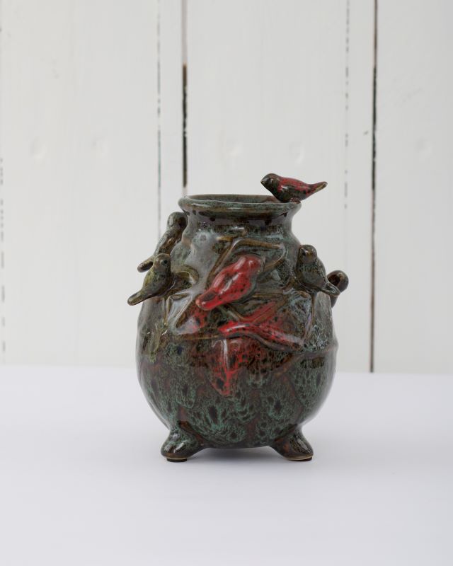 Ceramiczny, maleńki wazonik z ptaszkami. U podstawy dodatkowo znajdują się trzy nóżki. Stan bardzo ładny.