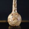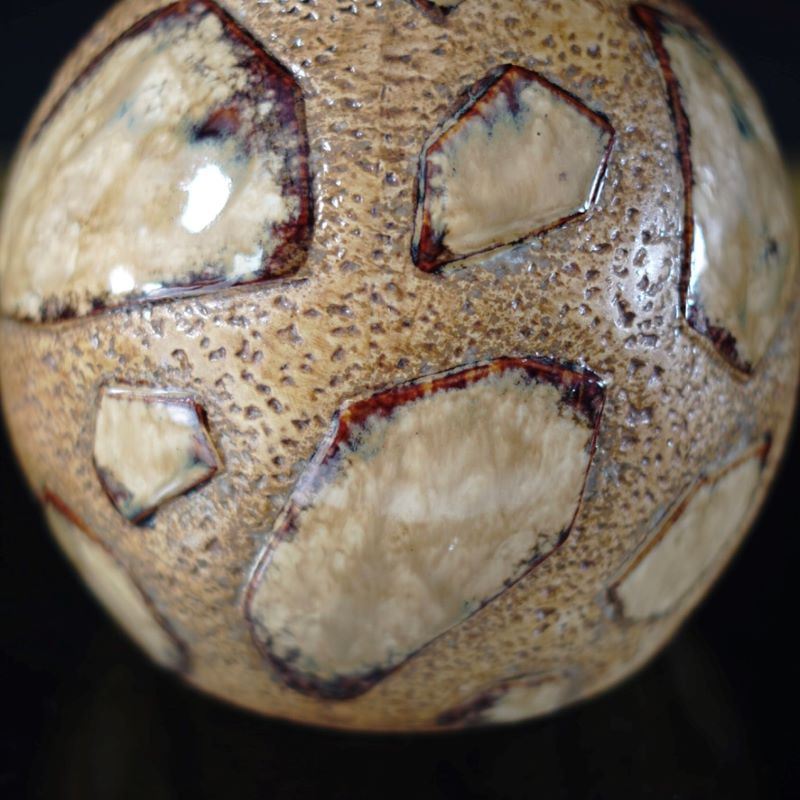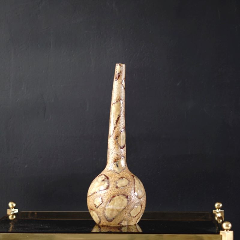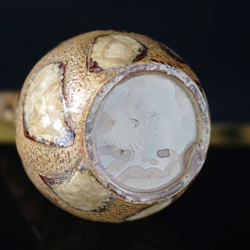 Ceramiczny wazon kształtem przypominający tykwę a wzorem kamienie na piasku lub żyrafę 🙂 Miejscowo szkliwiony. Na spodzie wypukły numer jako sygnatura. Nie udało nam się go zidentyfikować. Stan super.