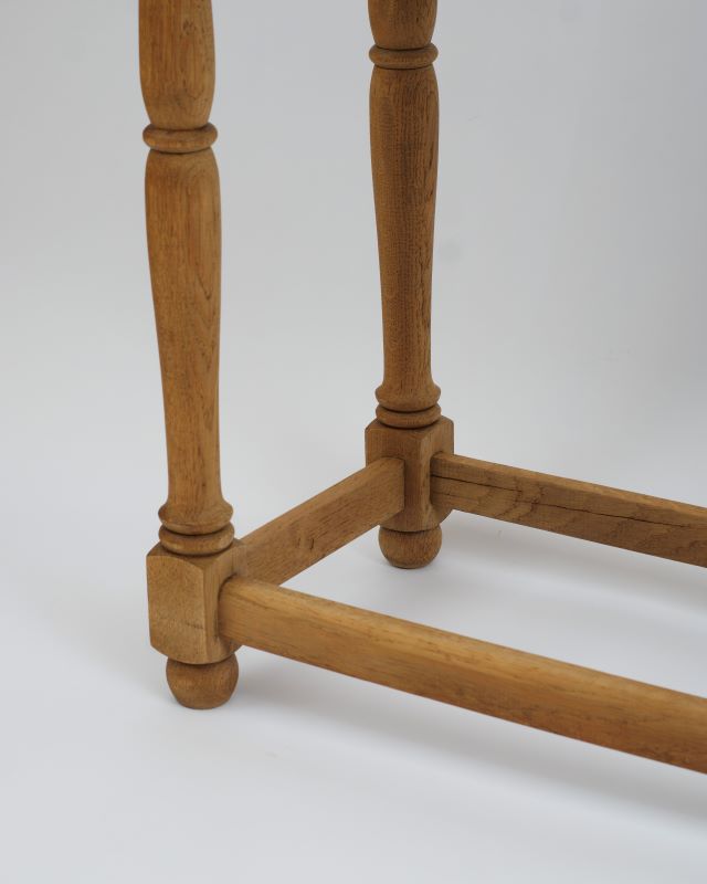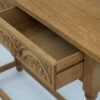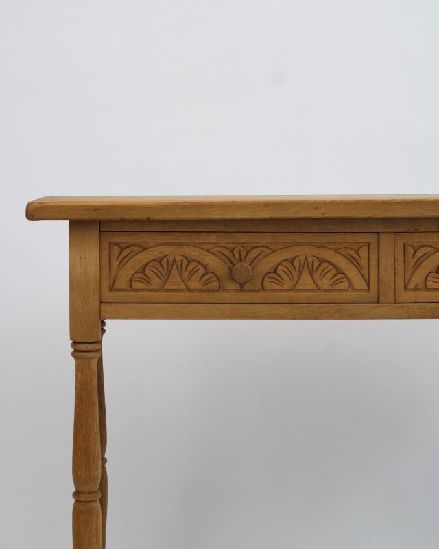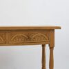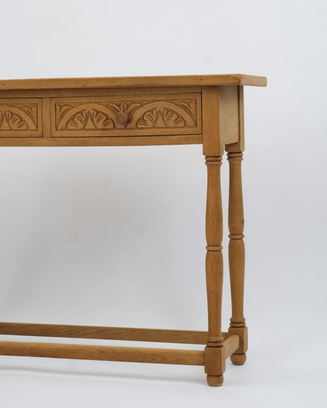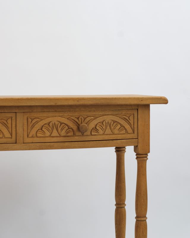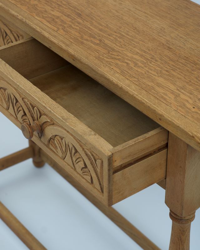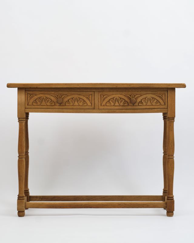 Konsola drewniana na toczonych nóżkach. Z przodu posiada dwie szufladki z rzeźbieniami. Powierzchnia została oczyszczona starannie do surowego drewna. Ma fajny kompaktowy rozmiar, który pozwala na umieszczenie jej nawet na małych powierzchniach.