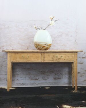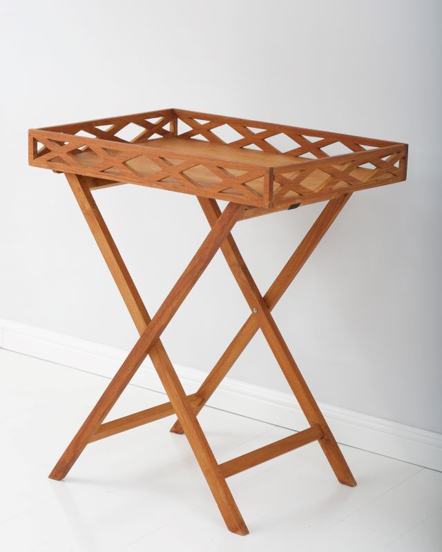 Drewniana taca na składanych nogach holenderskiej marki Riverdale. Taca wykonana jest drewna a jej ażurowe boki z metalu. Jest solidna, masywna i w bardzo ładnym stanie. Nogi są trochę niestabilne, delikatne ale ogólnie dają radę.