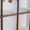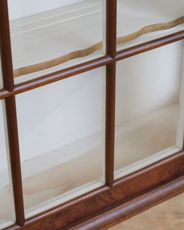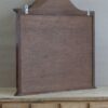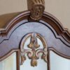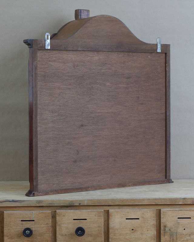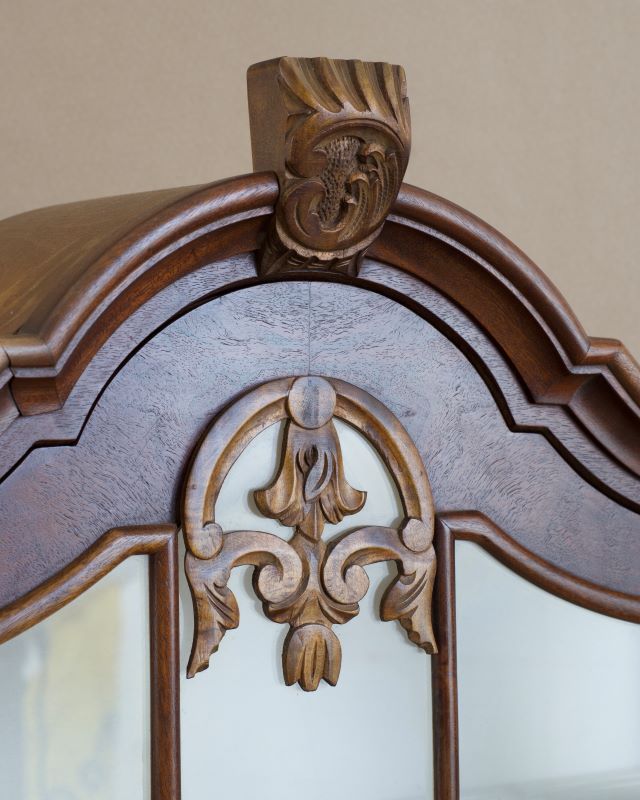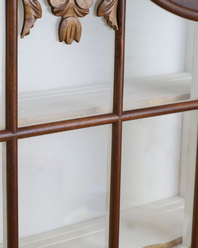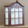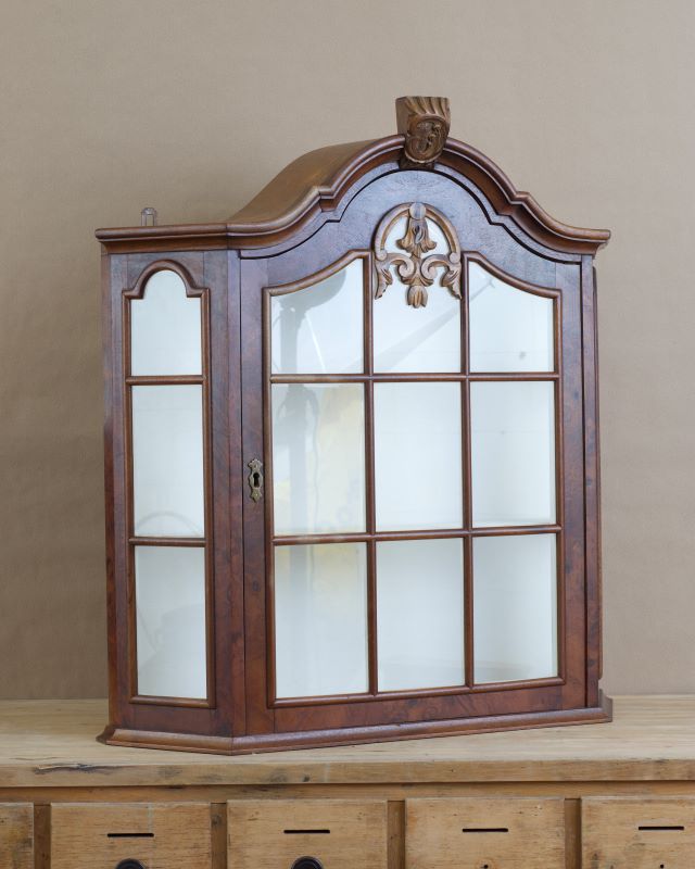 Witrynka drewniana z fantazyjnym dekorem. Wykonana z drewna orzechowego. Wnętrze białe, z dwiema półeczkami. Najniższy poziom posiada zabrudzenie. Z tyłu znajdują się dwa zaczepy do zawieszenia na ścianie.
