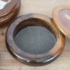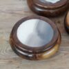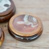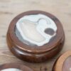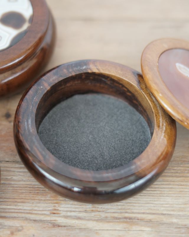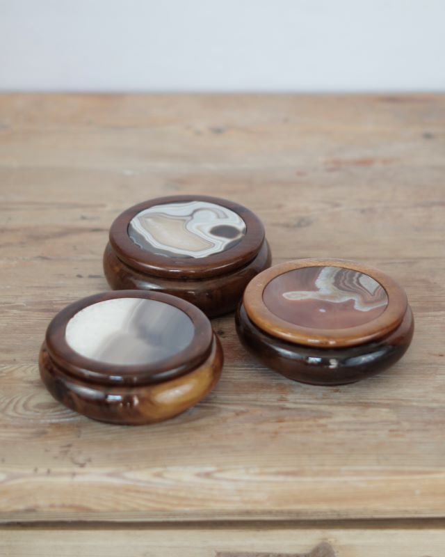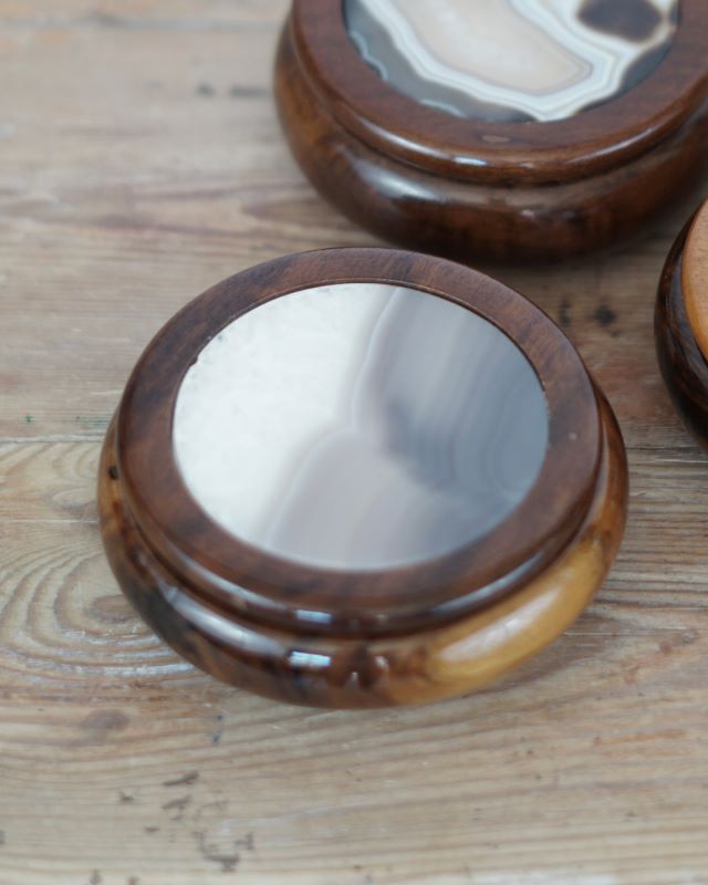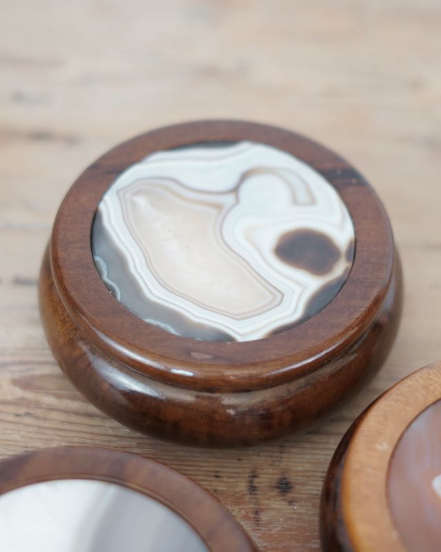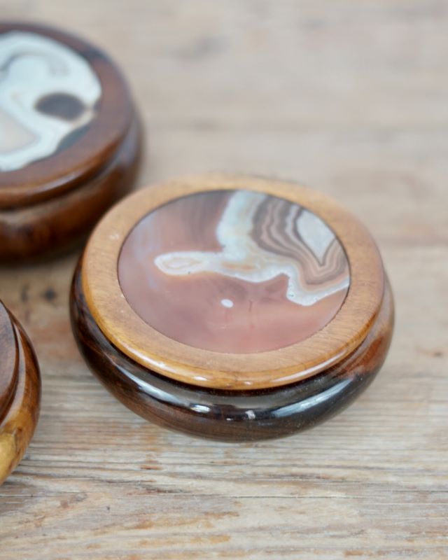 Drewniane, lakierowane puzderka na biżuterię, bibeloty z wiekiem ozdobionym naturalnym agatem. Jedno z nich, to szaro – białe ma maleńki uszczerbek kamienia na wieczku. Na zdjęciu widać to bardziej niż w rzeczywistości. Drewno jest w bardzo ładnym stanie vintage.