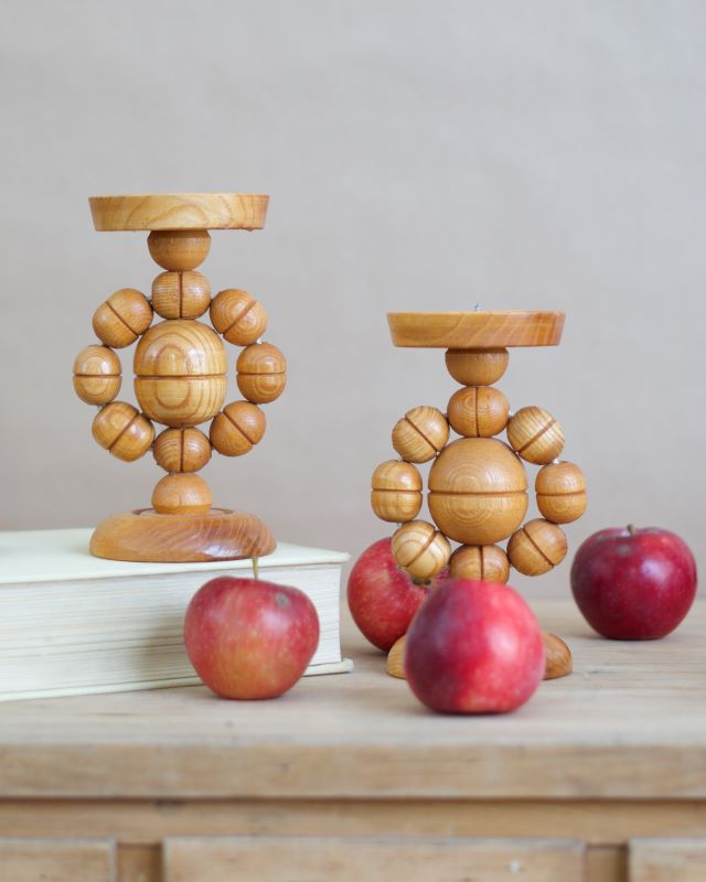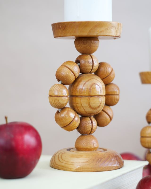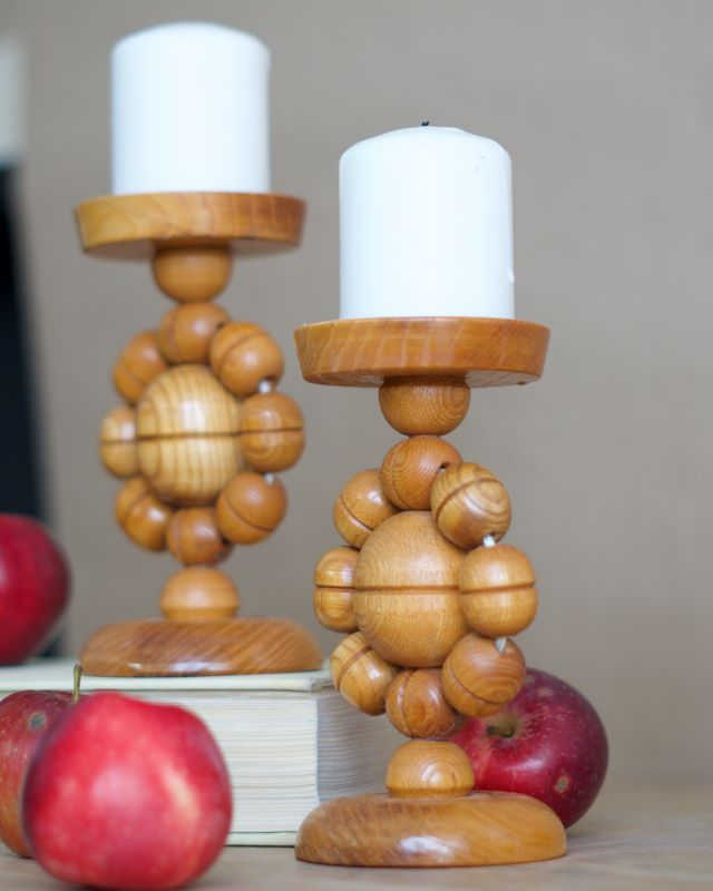 Drewniane świeczniki ludowe wykonane z toczonych elementów. Powierzchnia drewna lakierowana. Pochodzą ze Skandynawii. Stan bardzo dobry.