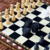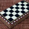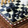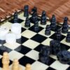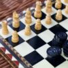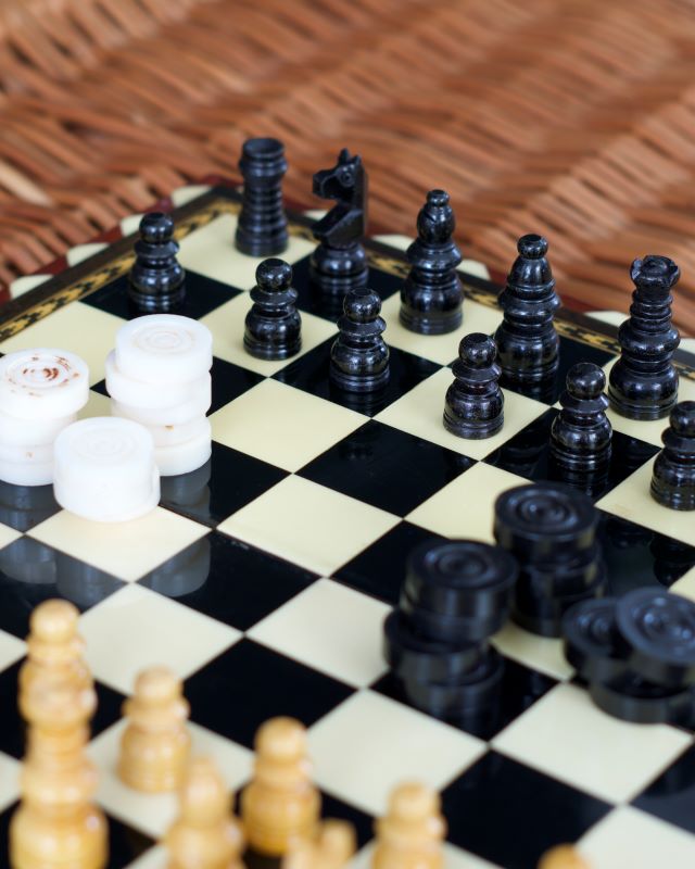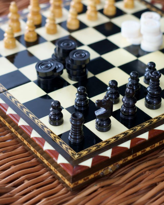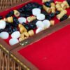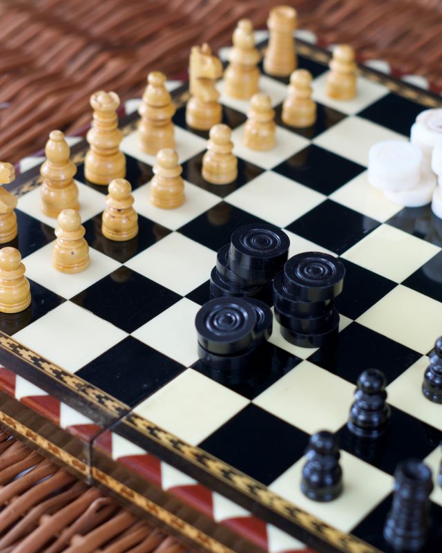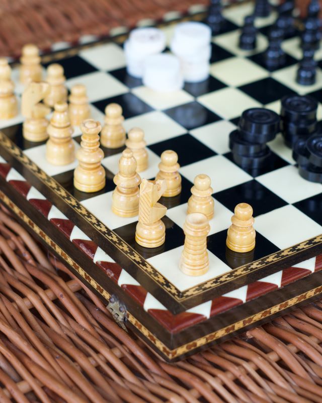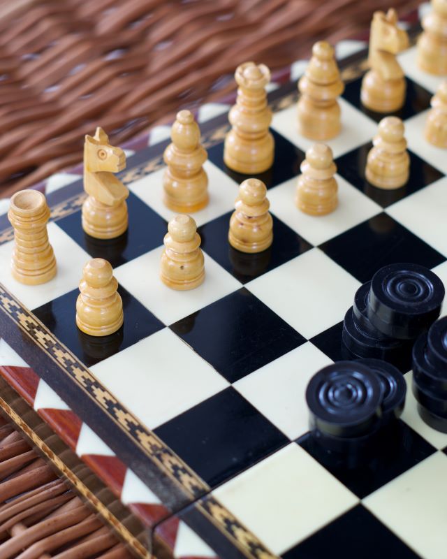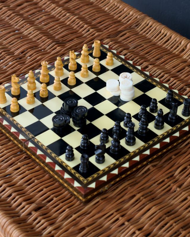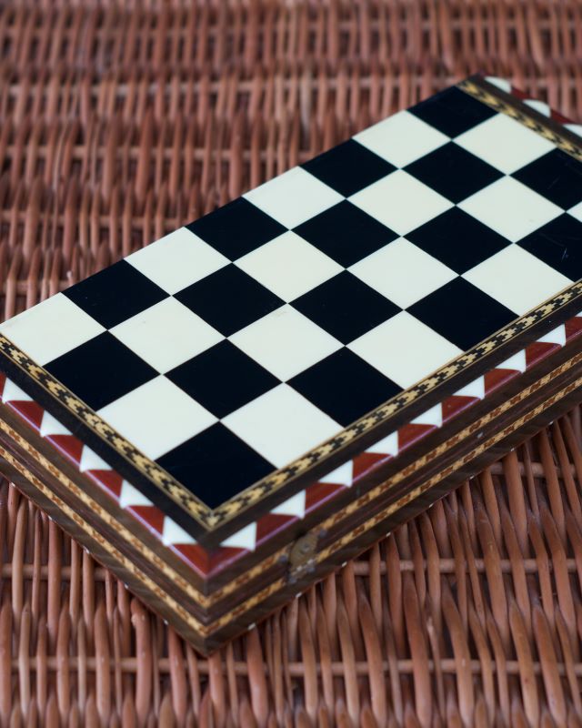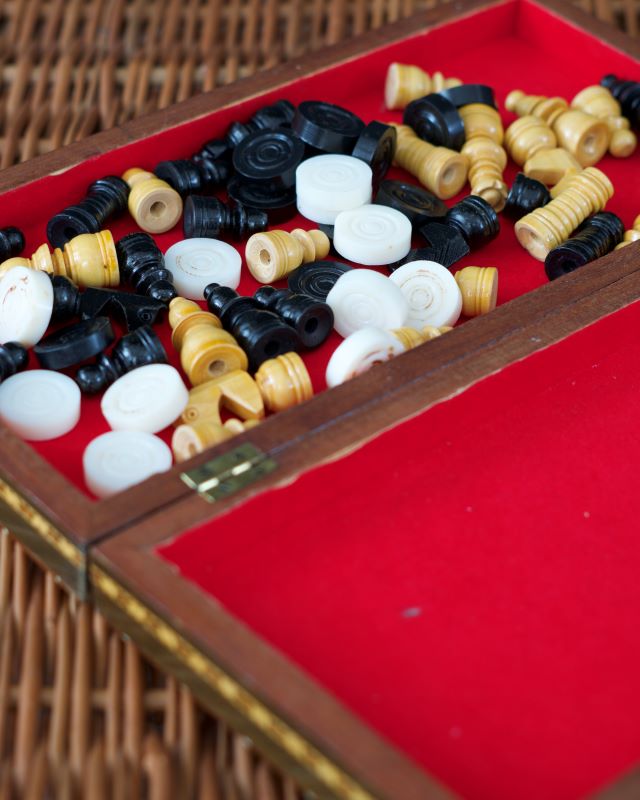 Drewniane figury szachowe i warcaby z tworzywa. Szachownica wykonana z drewna, wyściełana czerwonym aksamitem. Brak pudełka zewnętrznego. Stan całości bardzo dobry.