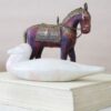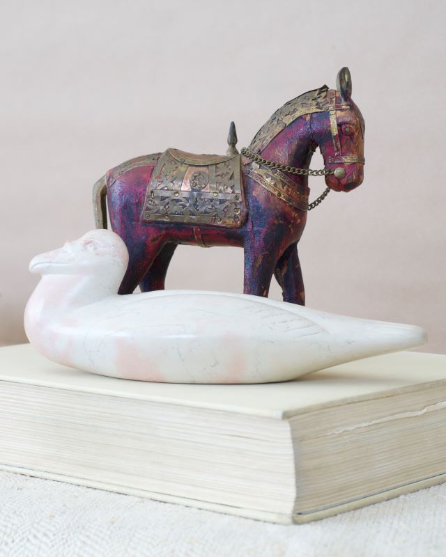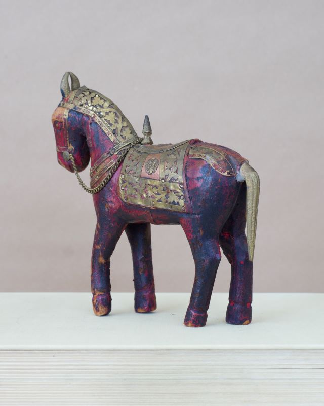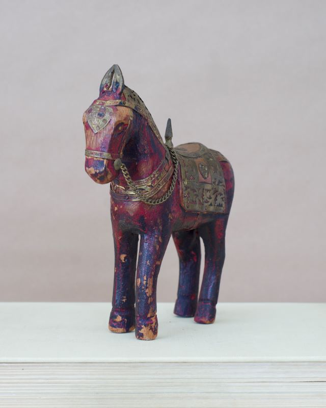 Drewniany, bardzo stary koń z uprzężą wykonaną z mosiądzu. Całość wykonana ręcznie.