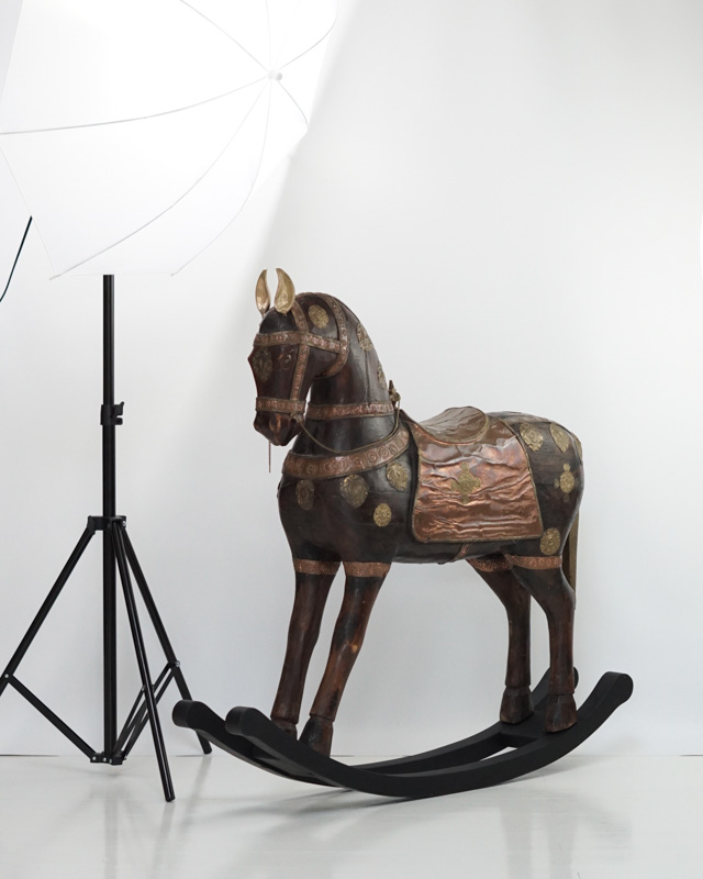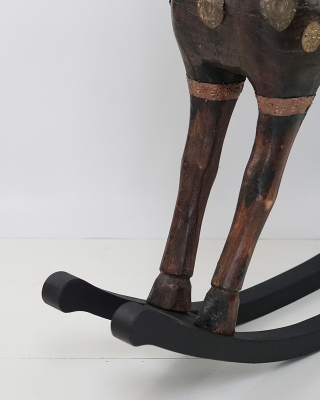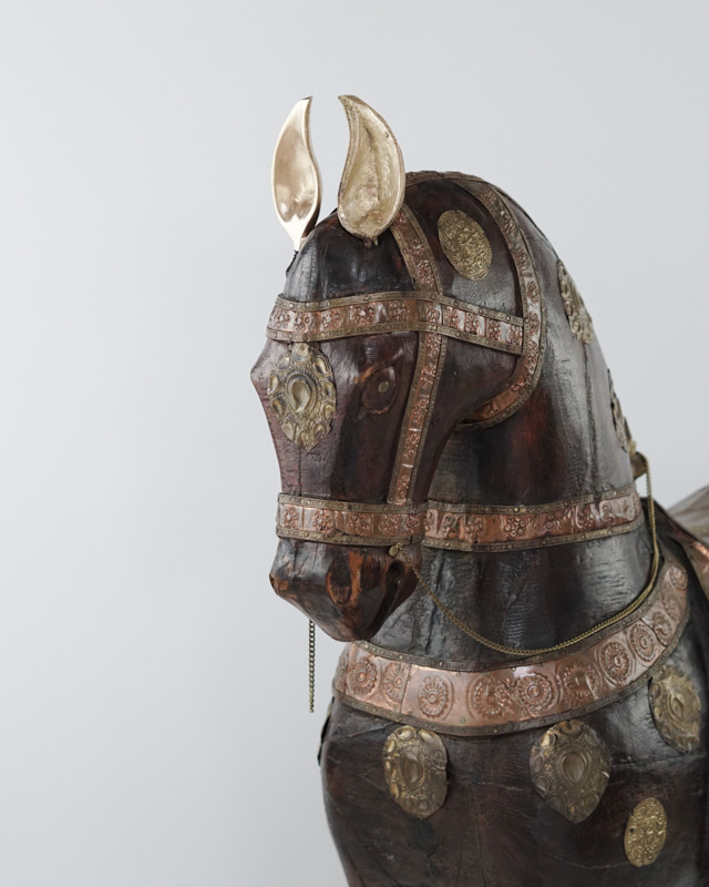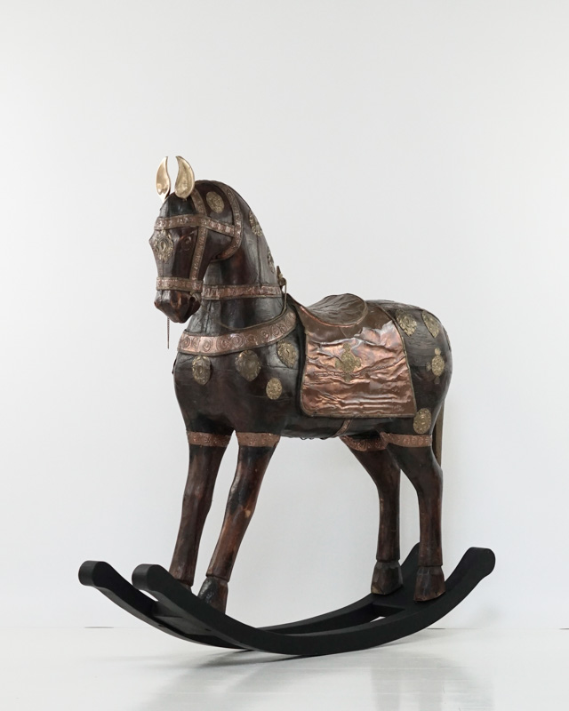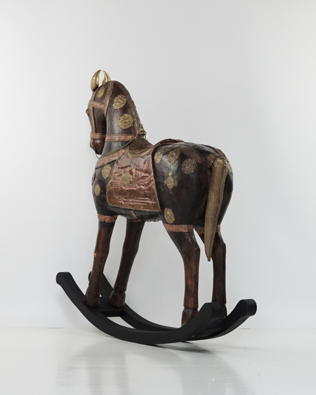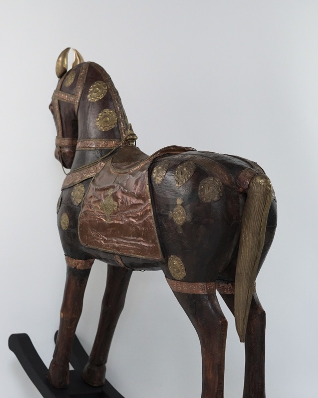 Mahoniowy koń Marwari na biegunach. Siodło, uzda oraz dekoracyjne elementy wykonane zostały ręcznie z miedzi i mosiądzu. Indie, koniec XIX początek XX w.