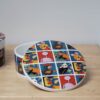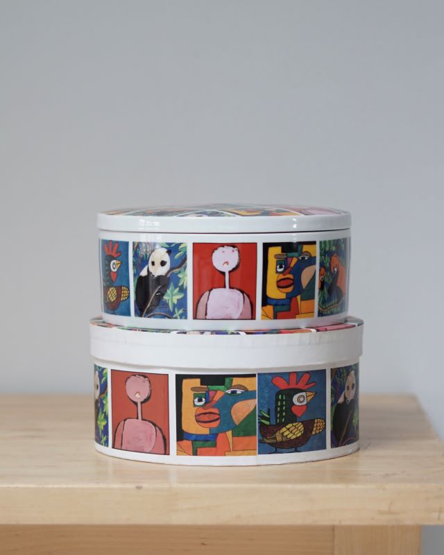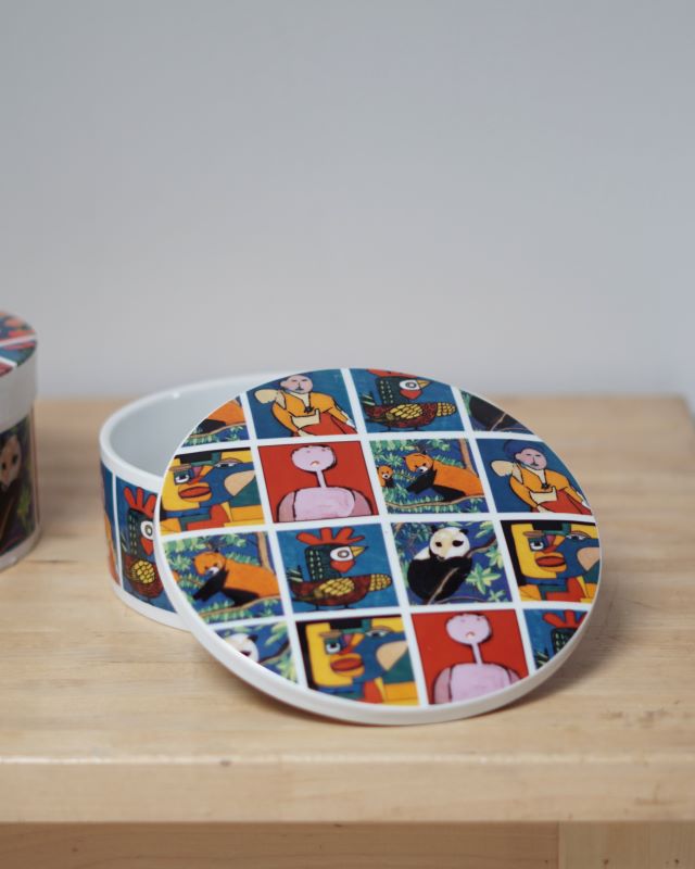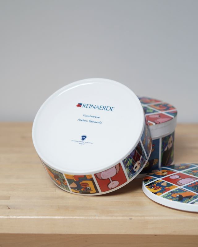 Duży porcelanowy pojemnik z pokrywą. Ręcznie malowany pod szkliwem, nadal zachowało się oryginalne kartonowe opakowanie. Można trzymać w nim ciastka, cukierki. Pojemnik pochodzi z limitowanej serii marki Reinaerde i przedstawia wizerunki różnych zwierząt, postaci wykonane przez mieszkańców Utrechtu.