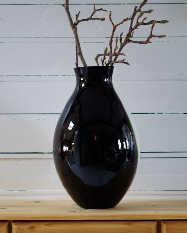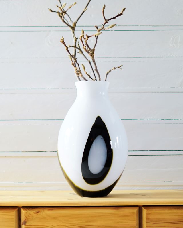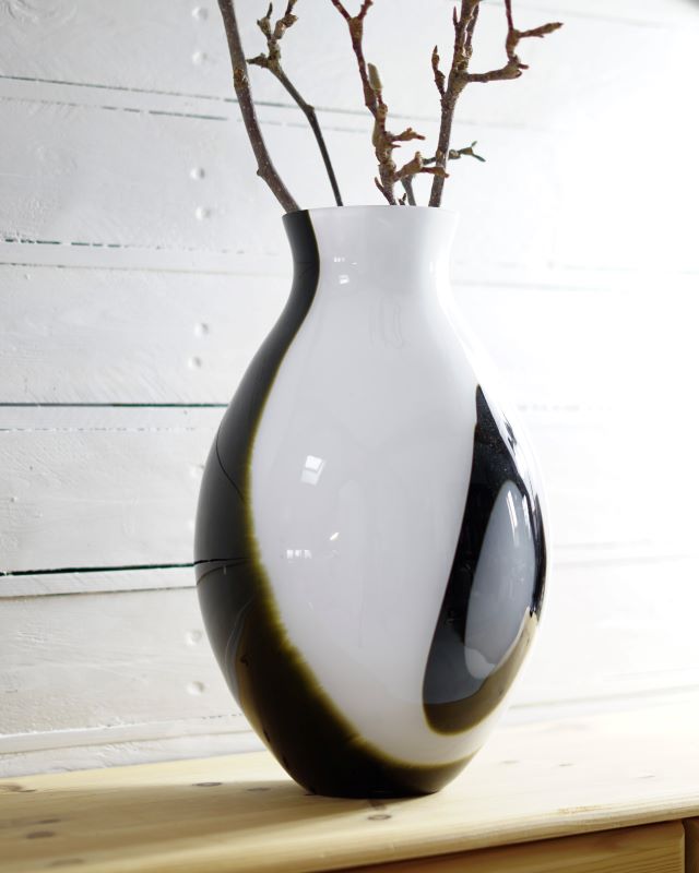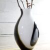 Bardzo duży szklany wazon w czarno – białych barwach. Wzory są wewnątrz masy szklanej. Stan bardzo ładny bez ubytków. Wyrób współczesny.