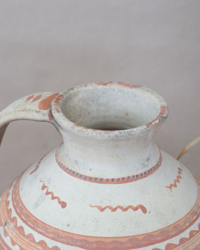 Gliniany dzban rumuński. Tradycyjna ceramika z prowincji Oltenia. Nosi ślady użytkowania, posiada nieduże ubytki na krawędziach wlewu.