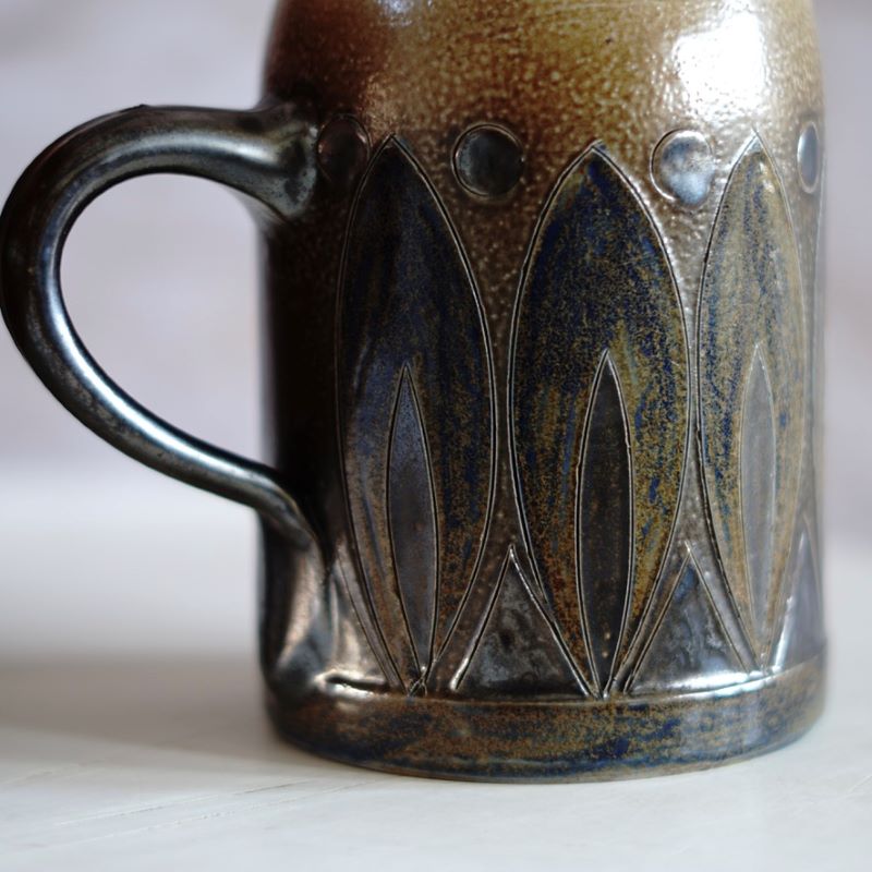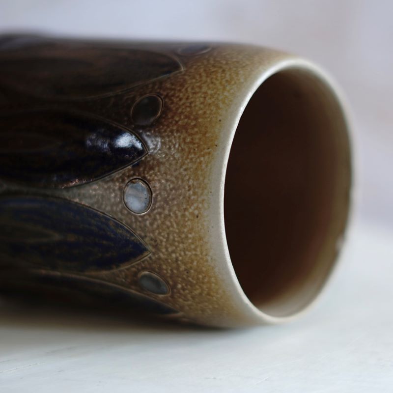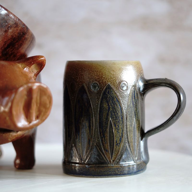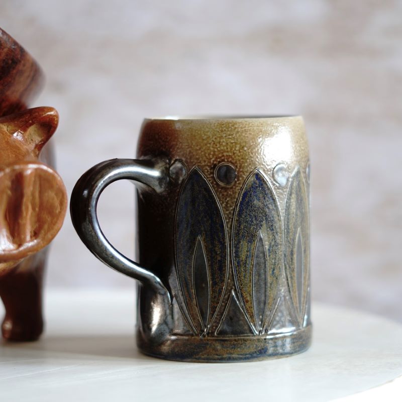 Kamionkowy, ładnie zdobiony kufel do piwa. Niemcy, lata 60 – te. Wykonany z tzw. solnej ceramiki. Kufel jest sygnowany, autor Elfriede Bazar – Kopp (1904 – 1983). Autorka i założycielka modernistycznej, niemieckiej ceramiki w Höher. Elfriede Bazar – Kopp była zwana niemiecką babcią ceramiki. Kufel nie ma śladów użytkowania ale po wewnętrznej stronie krawędzi ma malutki ubytek szkliwa. Powinno być go widać na przedostatnim zdjęciu. Można oczywiście używać go do picia piwa ale można też na ołówki. Jest to rzadkie znalezisko. Pojemność 550 ml.