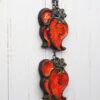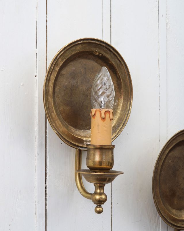 Rustykalne kinkiety wykonane z mosiądzu. Francja, poł. XX w. Sygnowane. Powierzchnia pięknie spatynowana, bez przebarwień. Instalacja wymieniona. Do zamocowania na ścianie wystarczy mały haczyk.
