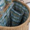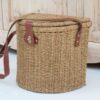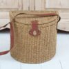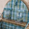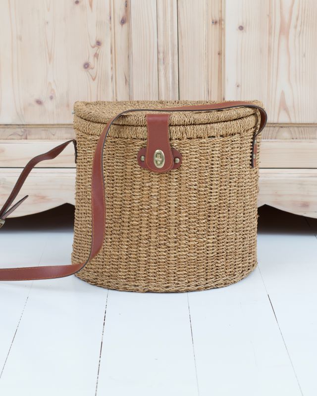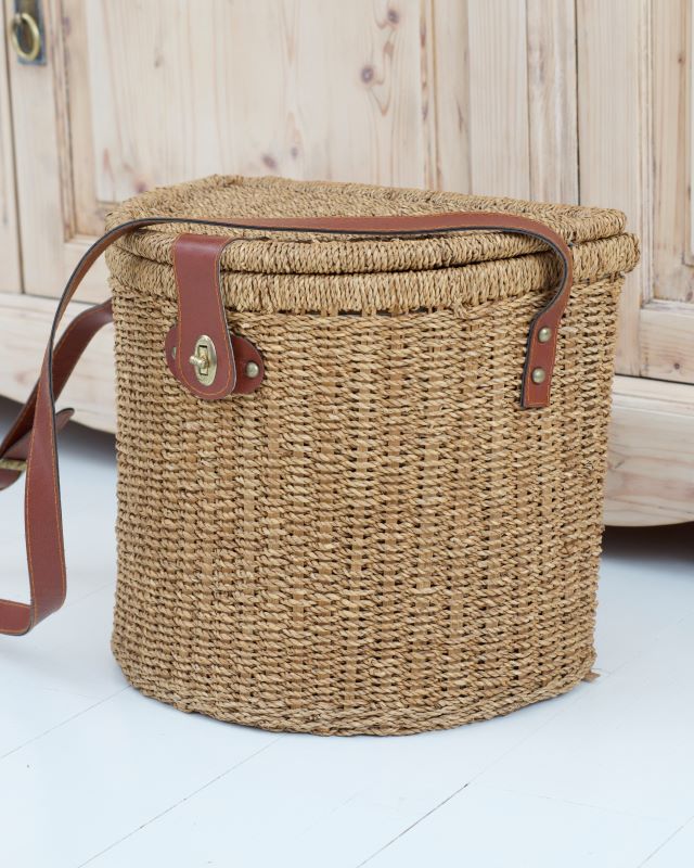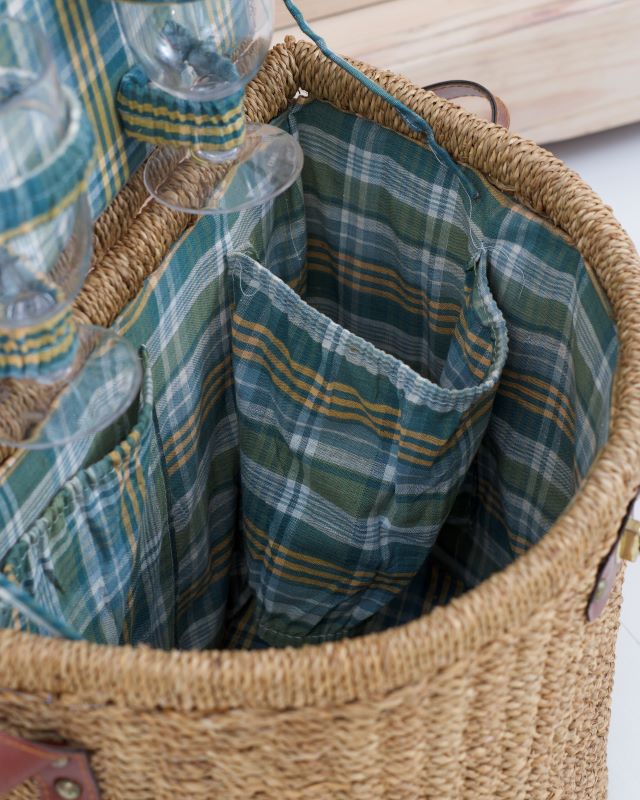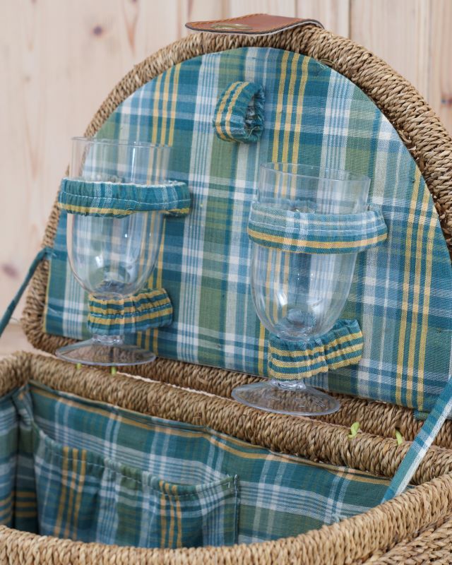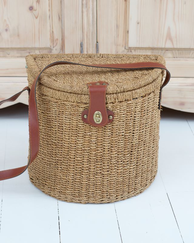 Koszyk piknikowy w kształcie półkola. Wewnątrz zachowały się dwa plastikowe kieliszki do wina. Pasek wykonany ze sztucznej skory. Stan bardzo ładny.