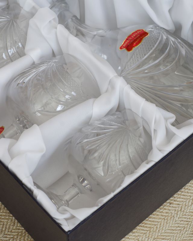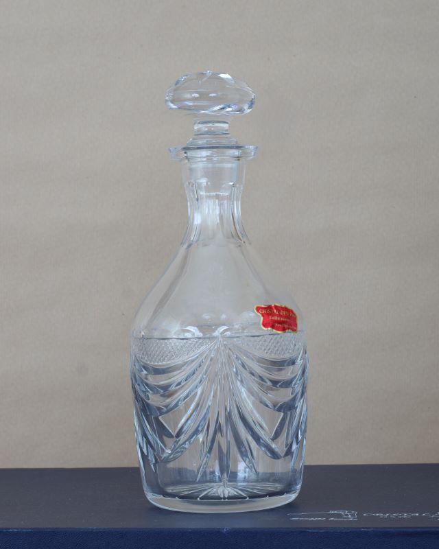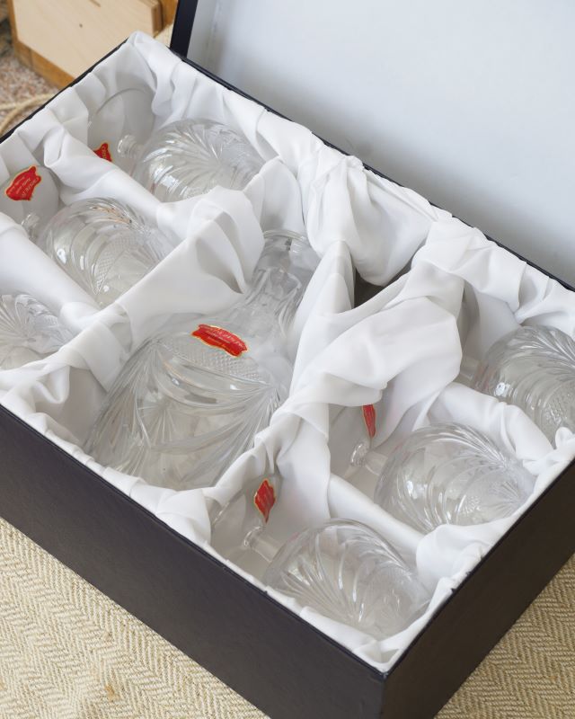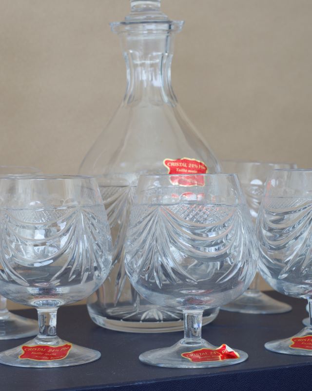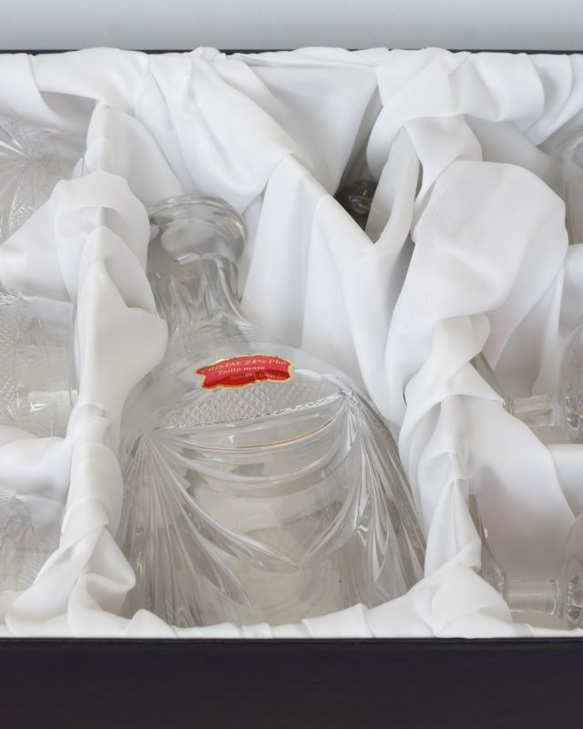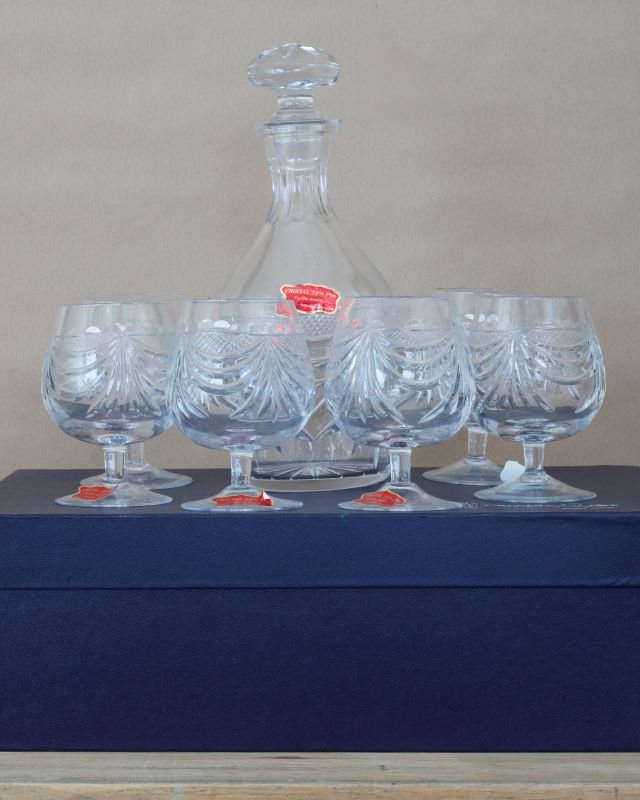 Kryształowy francuski komplet do mocnych alkoholi. Zachowało się oryginalne opakowanie. Stan bardzo ładny.