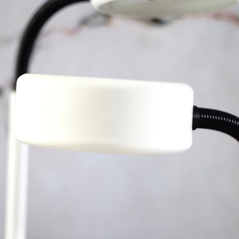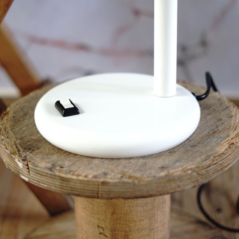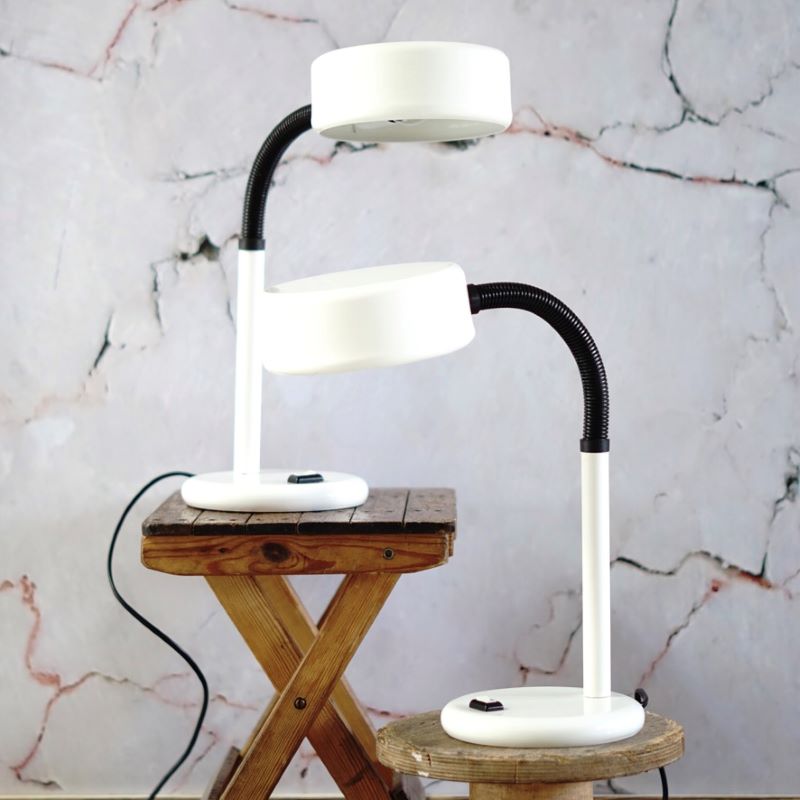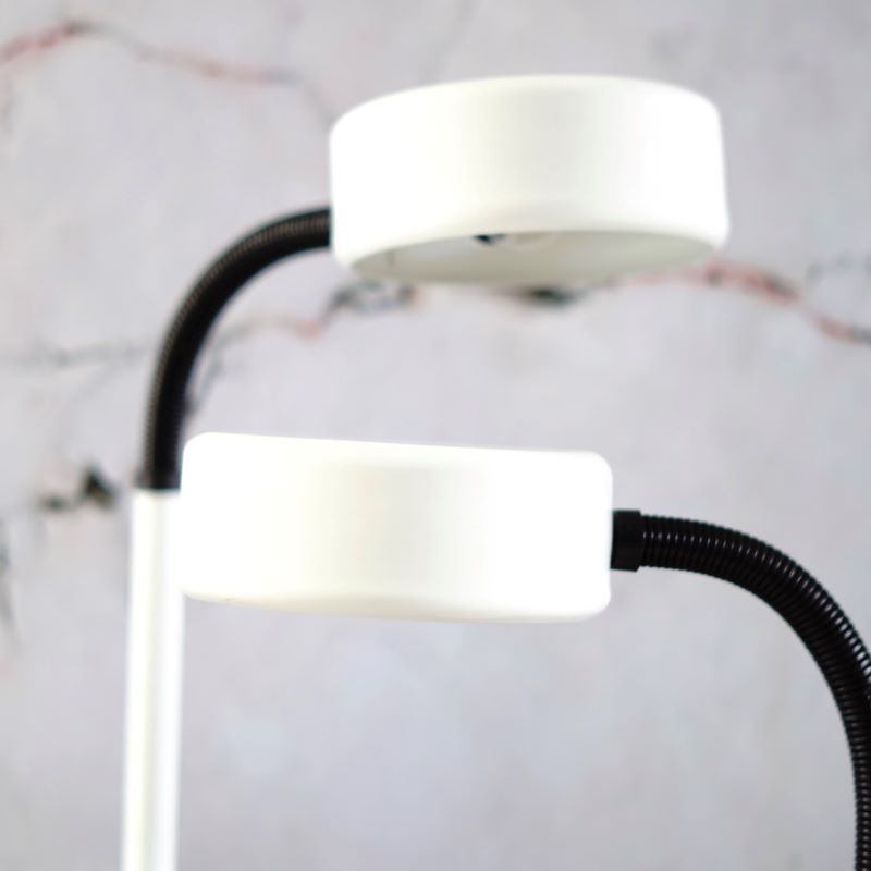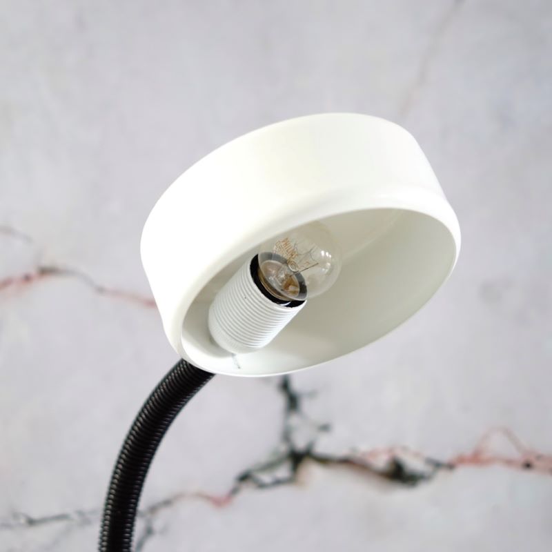 Lampki stołowe na regulowanym ramieniu. Lata 70 – te, w stylu Hala Zeist. Elastyczne ramię umożliwia używanie lampek w różnych pozycjach nachylenia klosza. Wykonane z metalu, ramię pokrywa tworzywo sztuczne. Lampki w idealnym stanie. Czyste, zadbane, sprawne. Pasują do nich żarówki z gwintem e-27.