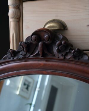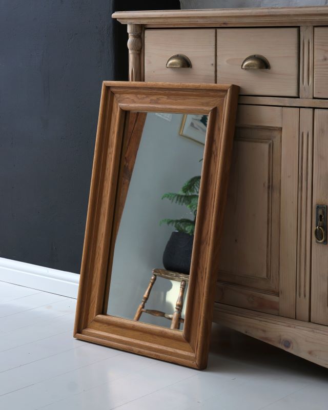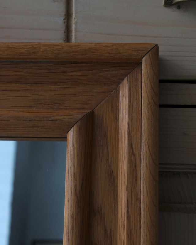 Lustro w dębowej ramie. Na tafli delikatne zarysowania, drewno w bardzo ładnym stanie. Do zawieszenia w pionie. Aby zawiesić je poziomo trzeba dorobić zawieszenie.