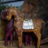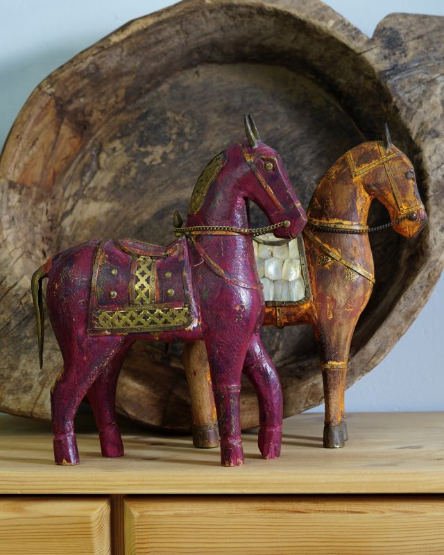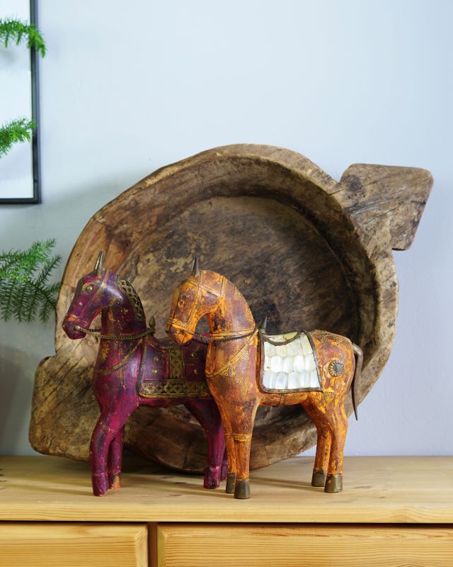 Mahoniowa figurka konia Rajasthani. Pięknie zdobiona mosiężnymi elementami. Ręcznie wykonana. Posiada drobne oznaki upływu czasu ale żadnych braków nie odnotowaliśmy.
