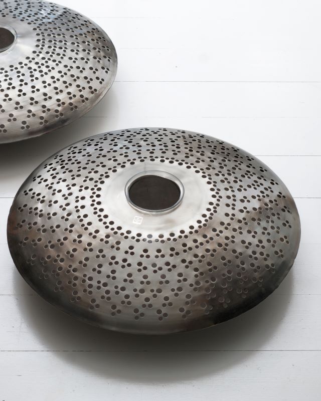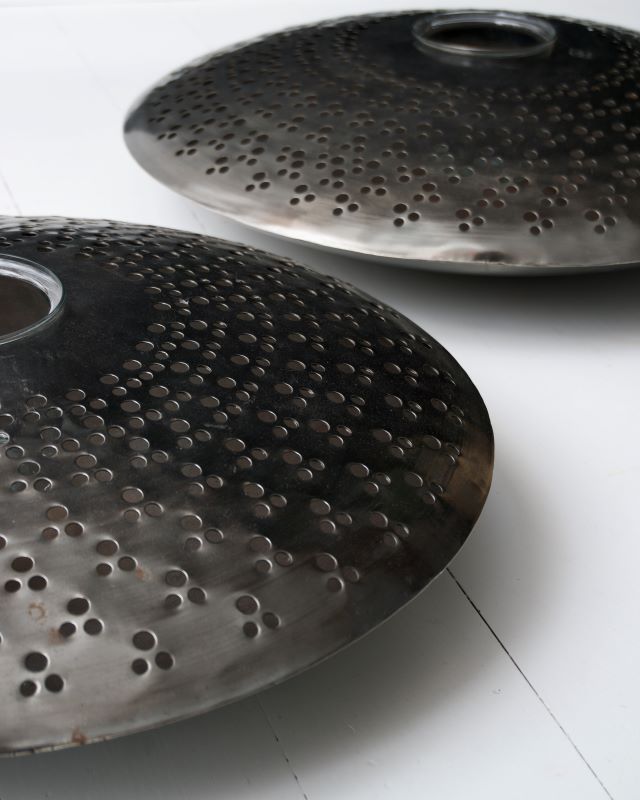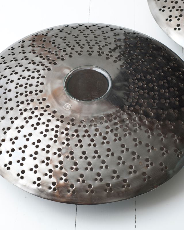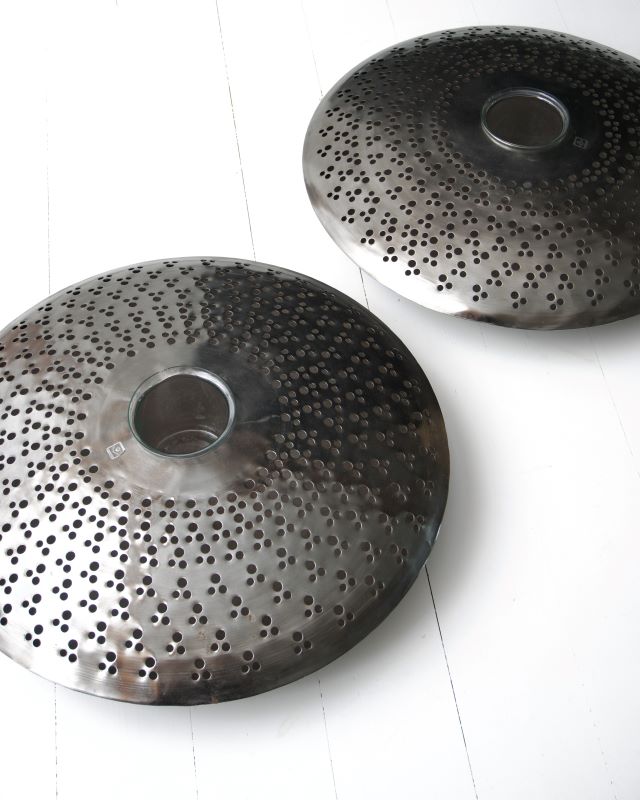 Metalowe świeczniki w kształcie spodków. Każdy ze szklanym pojemnikiem na świecę lub podgrzewacz. Jeden pojemnik delikatnie szczerbiony na krawędzi. Wada nie jest widoczna podczas użytkowania. Pojemniki szklane mogą też służyć za wazony na nieduży bukiet. Sprawdźcie wymiary, bo to są bardzo duże przedmioty. Na duży stół, wyspę czy komodę. Mogą też stać na podłodze. Pojemniki zawieszone są w powietrzu więc spód nie nagrzewa się. Stan ogólny bardzo ładny.