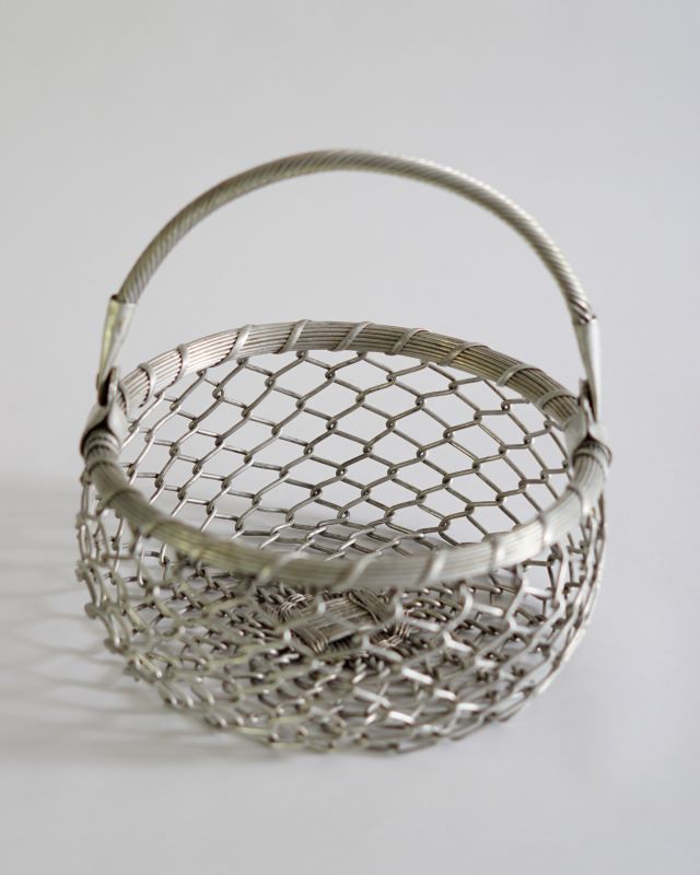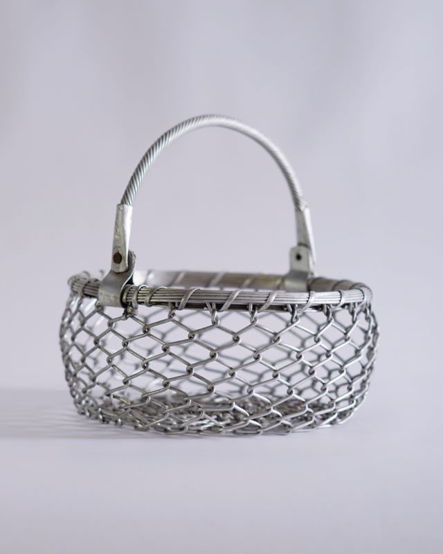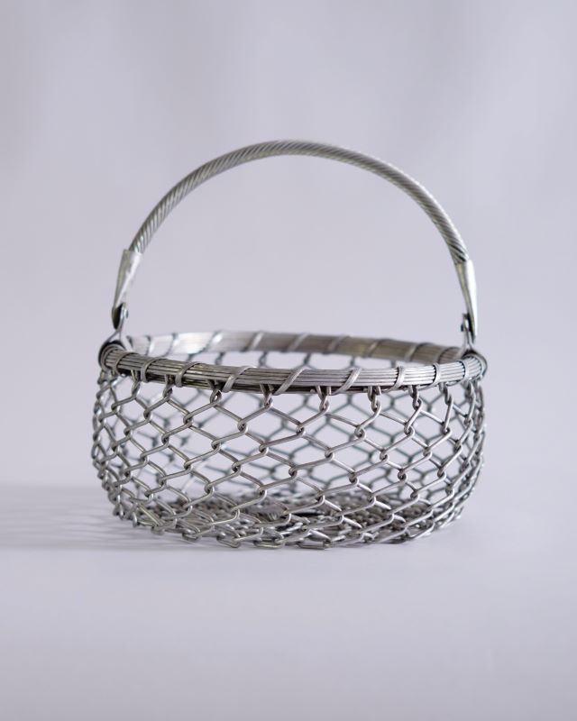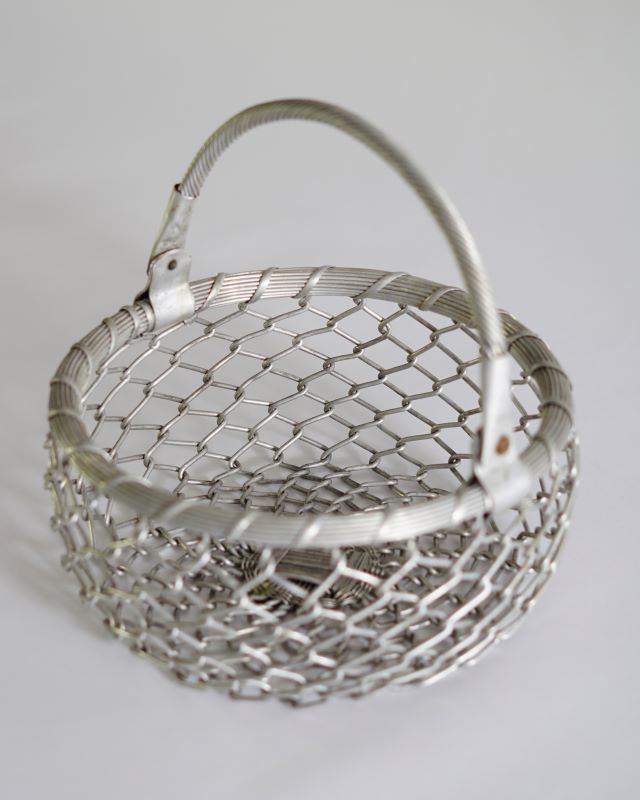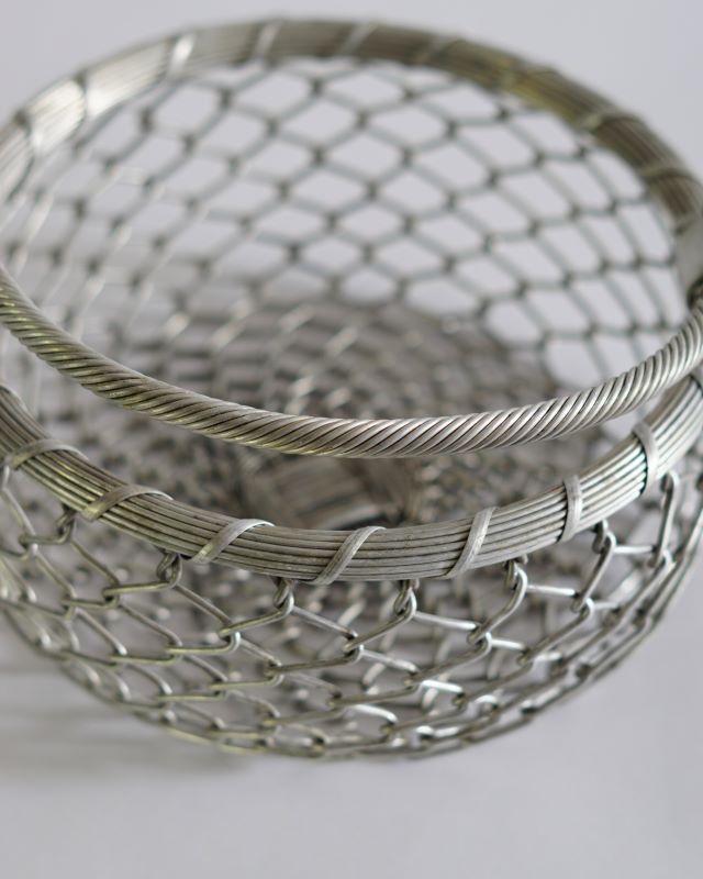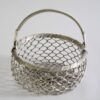Nieduży koszyk wykonany z metalowej, solidnej siatki. Pochodzi z Indii. Jest odrobinę niesymetryczny ale takie bywają uroki przedmiotów wykonanych ludzką ręką. Stan bardzo ładny.