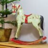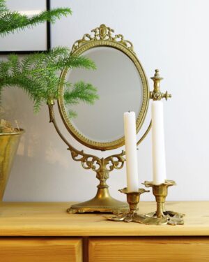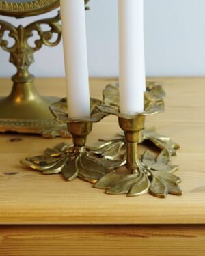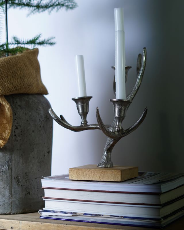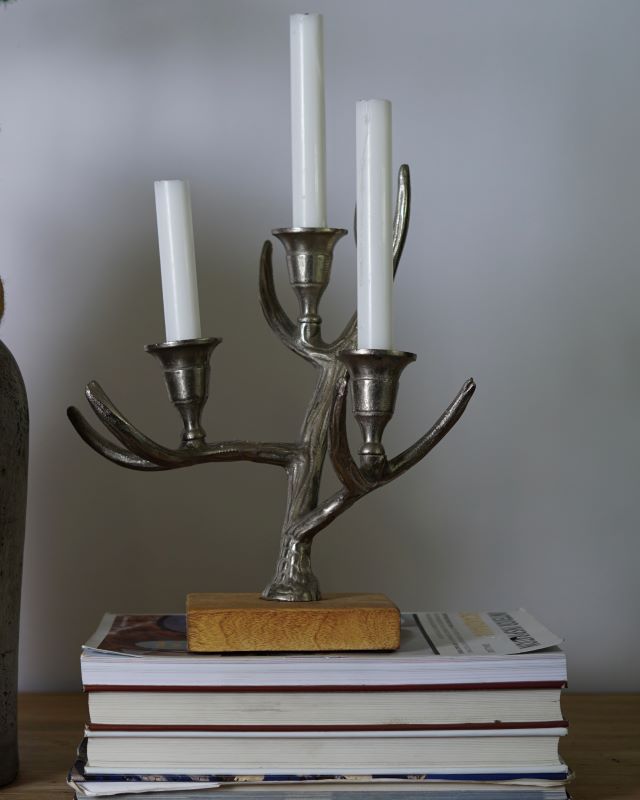 Metalowy świecznik w kształcie poroża. Na trzy zwykłe świece. Całość stoi na drewnianej podstawie. Świecznik nosi delikatne ślady użytkowania wewnątrz mocowań świec w postaci pozostałości wosku. Na zewnątrz ładny i bez specjalnych oznak użytkowania.