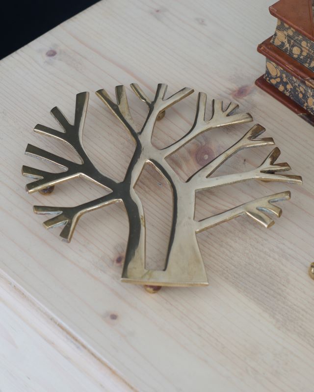 Mosiężna podstawka pod gorące naczynia w kształcie drzewa.