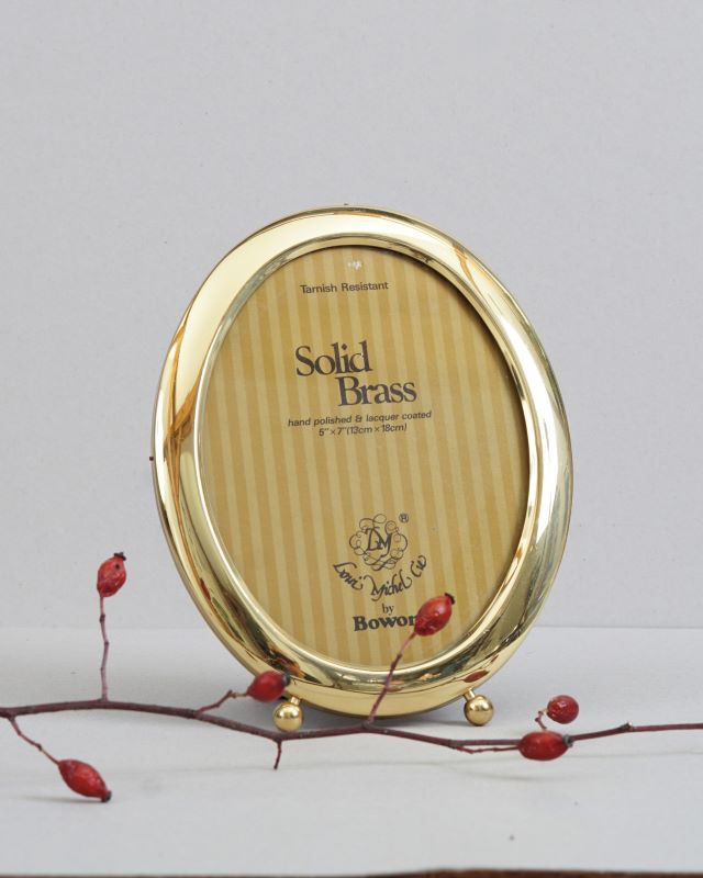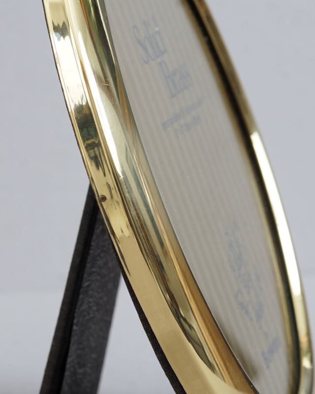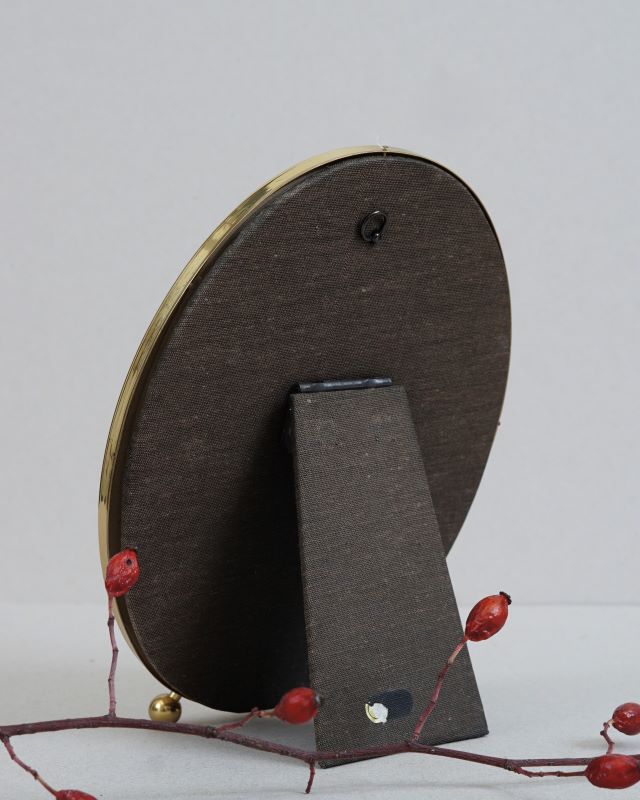 Mosiężna ramka do zawieszenia lub postawienia. Powierzchnia mosiądzu jest polerowana i lakierowana, co zapobiega matowieniu mosiądzu. Stan ogólny bardzo dobry. Plecki ramki mocowane są na cztery szpilki. Dwóch brakuje ale można zastąpić je zwykłymi szpilkami. Mimo tego braku plecki trzymają się bez problemu.