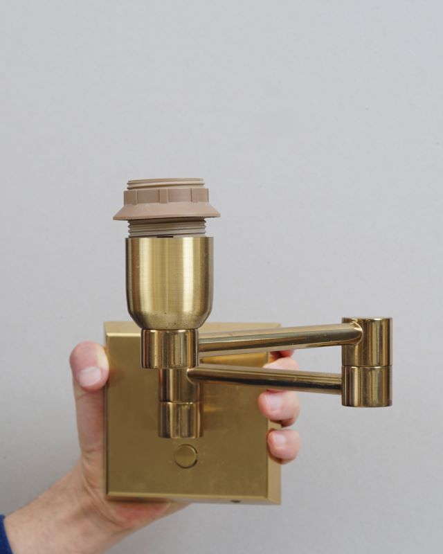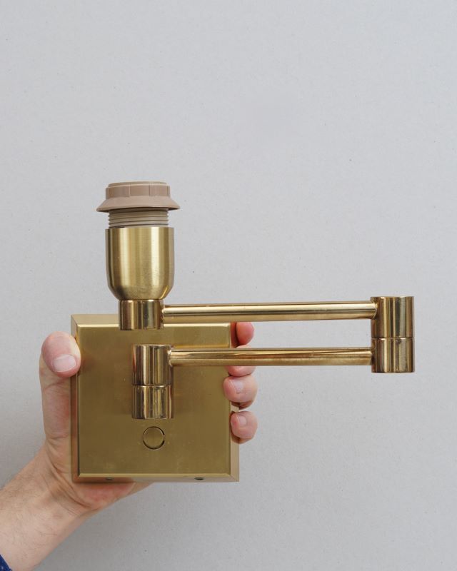 Mosiężne kinkiety z łamanym, ruchomym ramieniem niemieckiej marki Baulmann Leuchten, lata 90 – te. Zaprojektowano je w stylu Mid – century. dla niemieckiej branży HoReCa. Wykonane są z solidnego mosiądzu. Noszą niewielkie ślady użytkowania oraz upływu czasu ale ich stan nadal określamy na bardzo dobry.