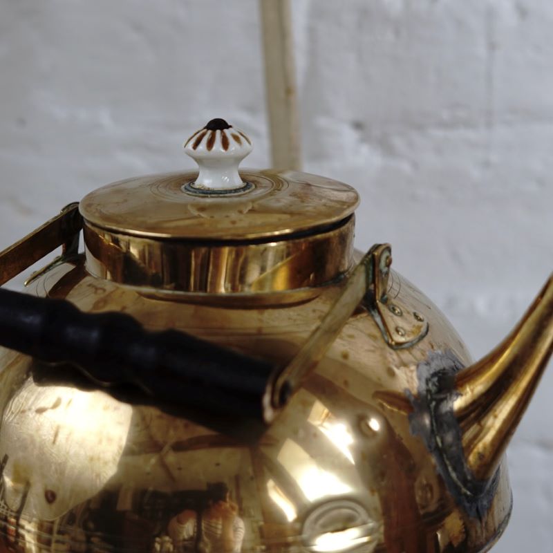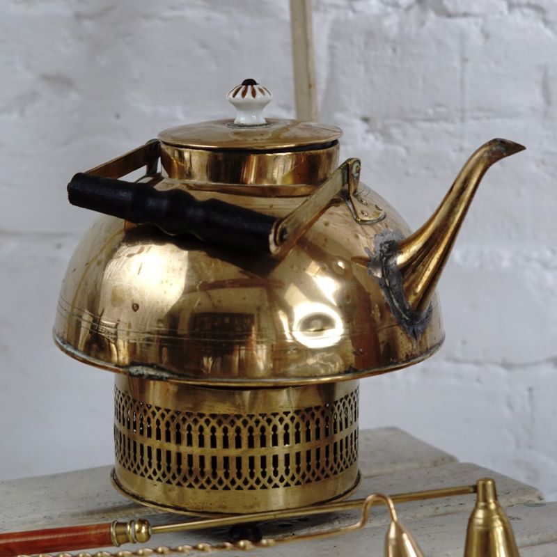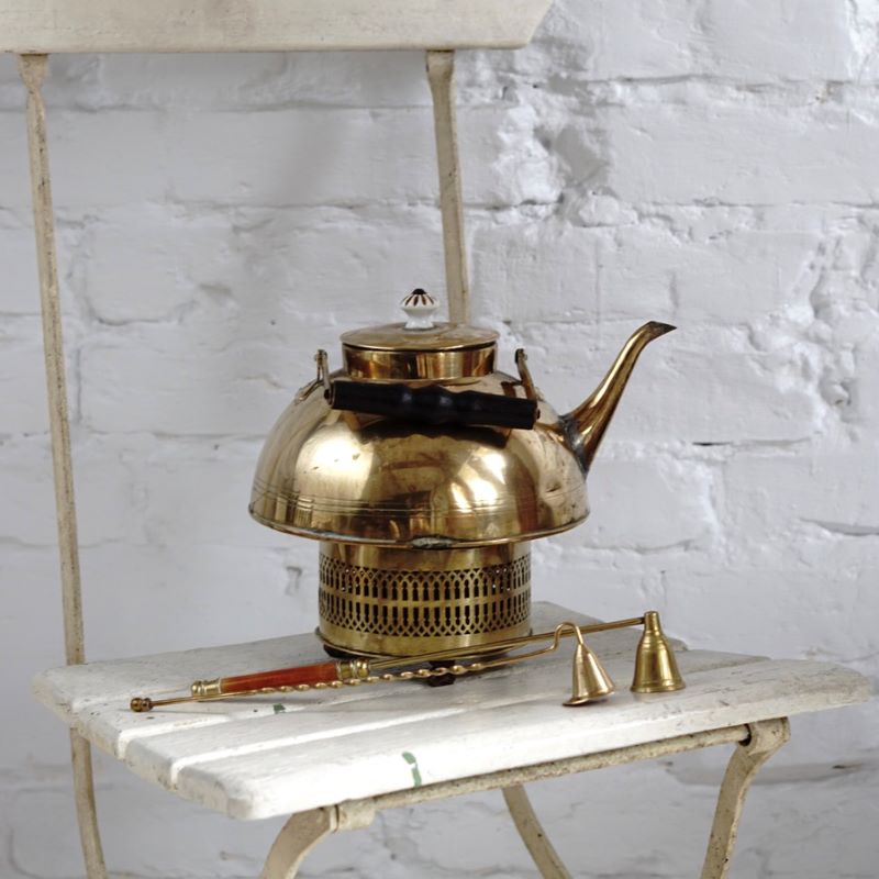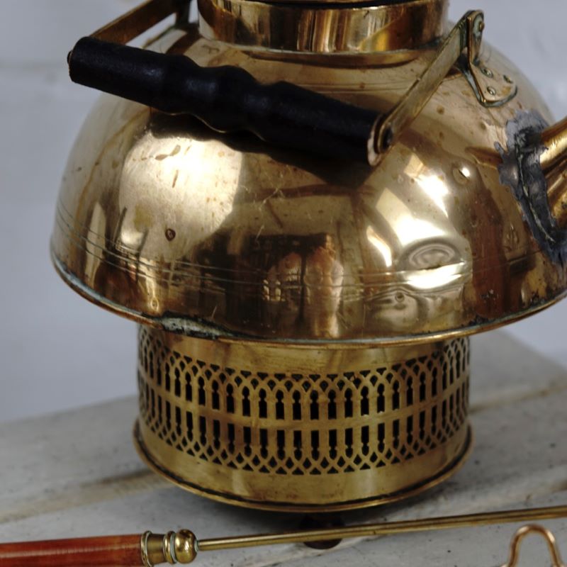 Mosiężny czajnik z kominkiem do gotowania wody. Trochę przeszedł, nie jest szczelny. Może służyć jako dekoracja. Pojemność 2 lt.