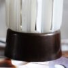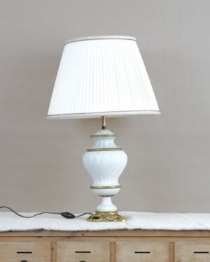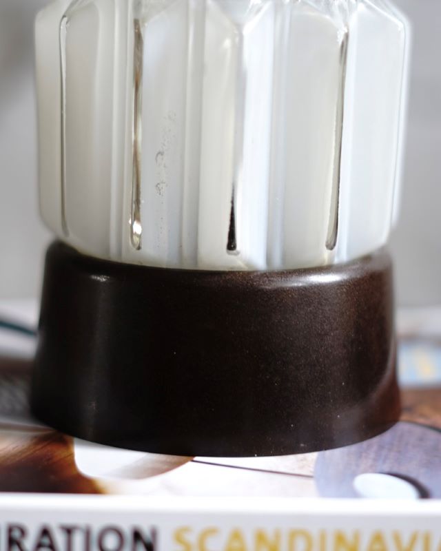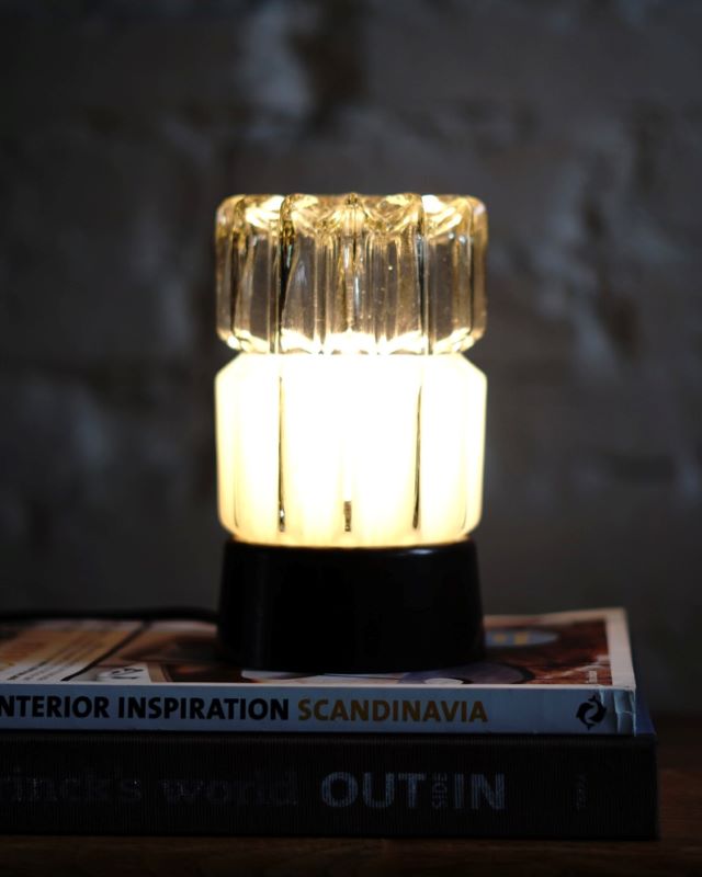 Niewielka stojąca lampka na bakelitowej podstawie i ze szklanym kloszem, oryginalna, wyprodukowana przez firmę Thabur z Hagi, w latach 30 – 40 tych. Lampki tej wytwórni, mimo różnych kloszy powstały tylko w jednym rozmiarze. Może też służyć jako lampka sufitowa. Posiada drobne oznaki użytkowania. Instalacja została wymieniona na nową. Na kablu znajduje się włącznik/wyłącznik do lampki.