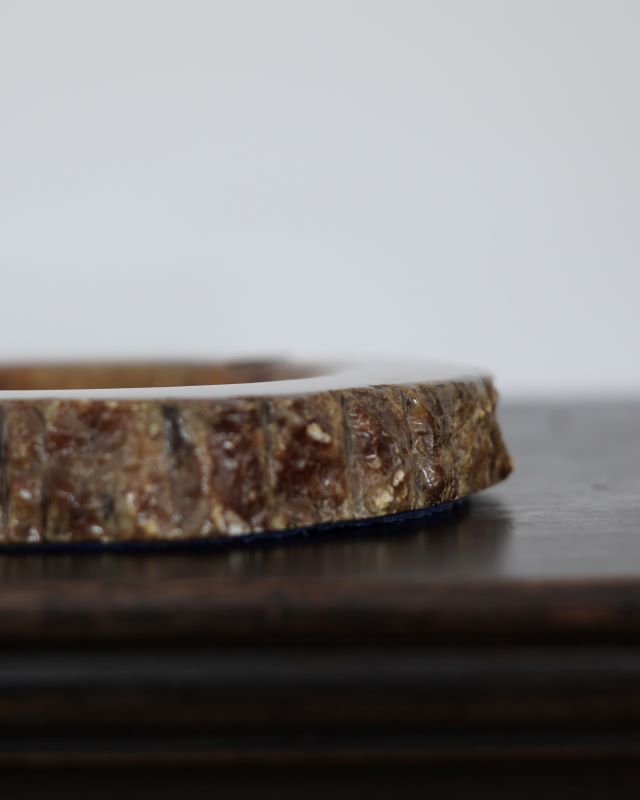Duża kamienna popielnica, która może służyć jako podkładka na kadzidełka. Widać na dnie, że była wykorzystywana zgodnie z przeznaczeniem. Jest na nim ślad powstały od wysokiej temperatury. Ale jest też bardzo stara. Powstała wskutek rozcięcia litego kamienia.