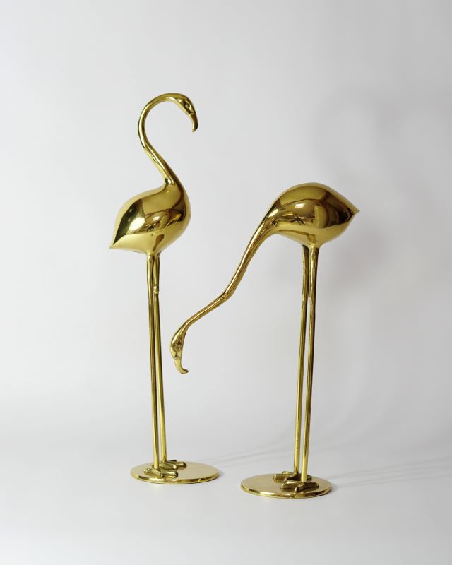 Para mosiężnych flamingów w stylu Hollywood Regency. Zaprojektowane przez firmę Apko w latach 60 – tych ubiegłego wieku. Na powierzchni mosiądzu można dostrzec delikatne ślady patyny, ryski. Całość jednak prezentuje się pięknie również za sprawą rozmiarów tych figurek. Sprzedajemy tylko w komplecie.