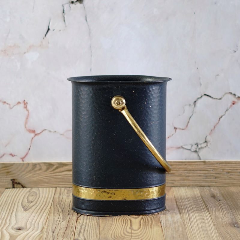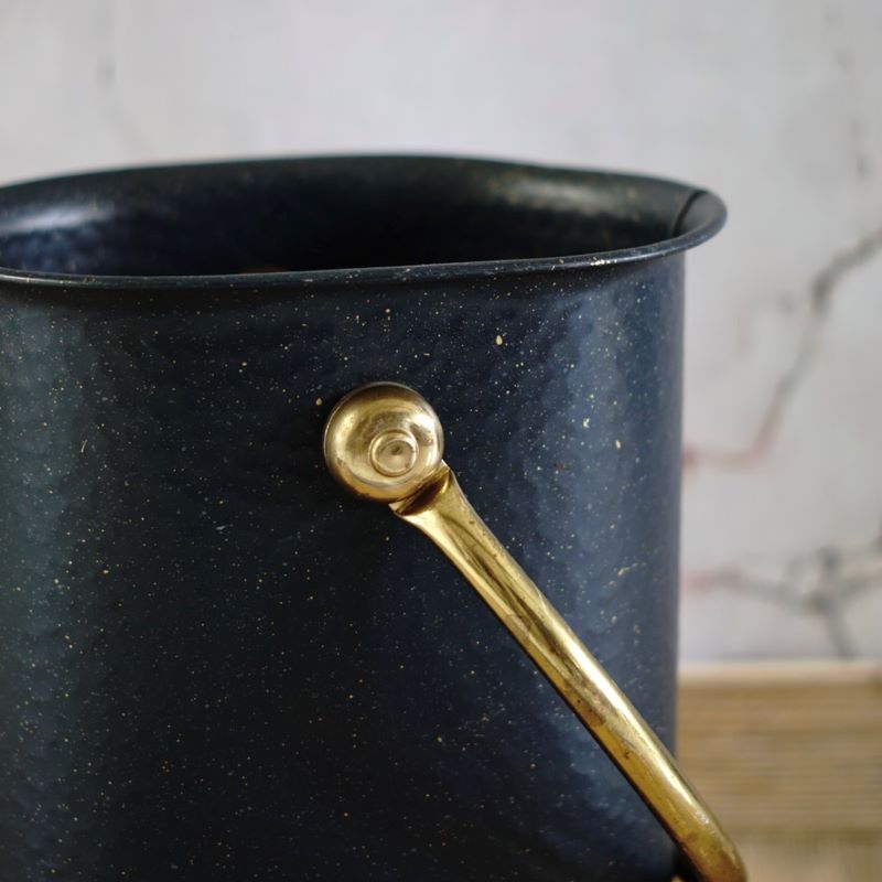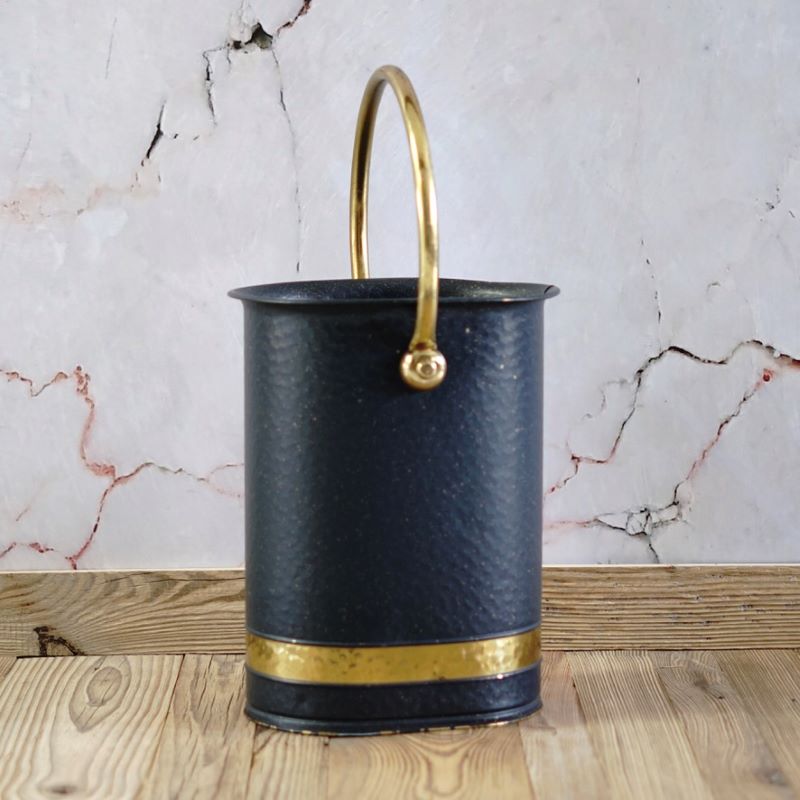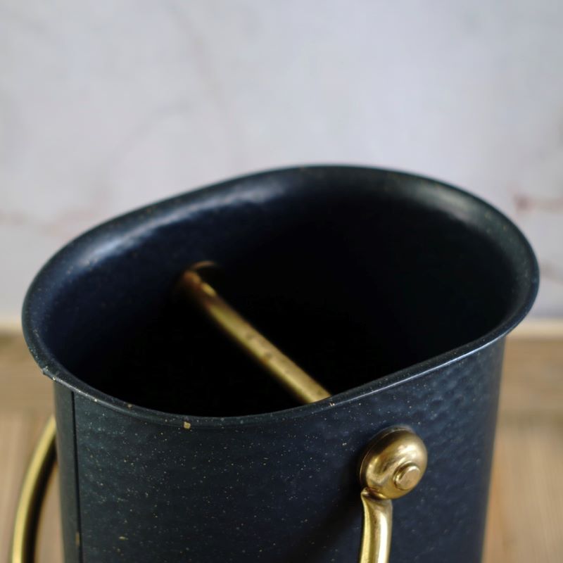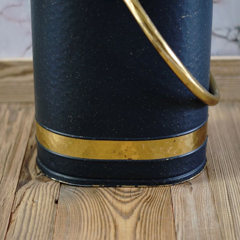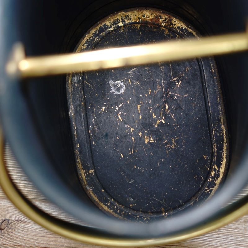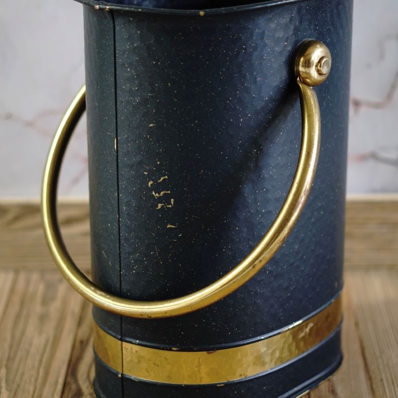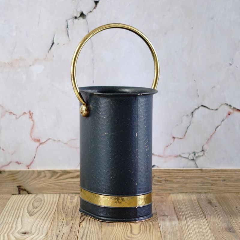 Parasolnik z mosiężnej, młotkowanej blachy. Pomalowany proszkowo na grafitowy kolor. Farba gdzieniegdzie jest otarta, mosiądz posiada drobne ślady patyny. Mimo to parasolnik jest bardzo dekoracyjny i dobrze będzie pełnił swoją funkcję. W środku dzielony mosiężną rurką.