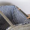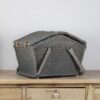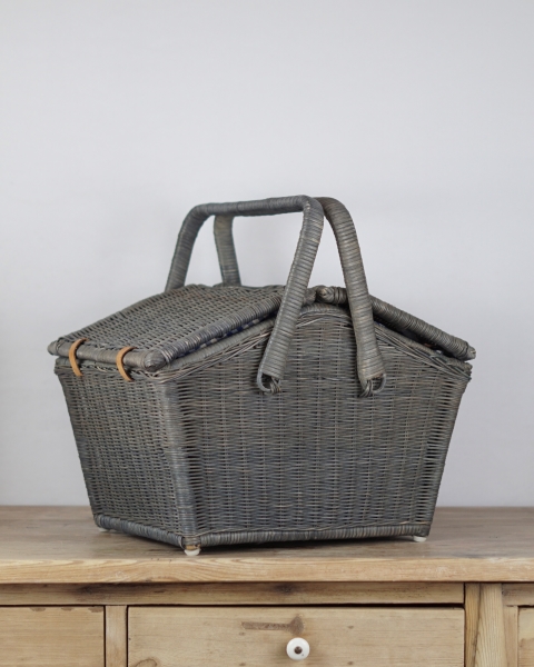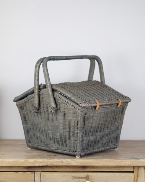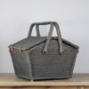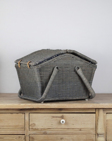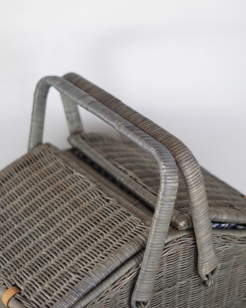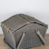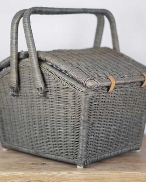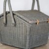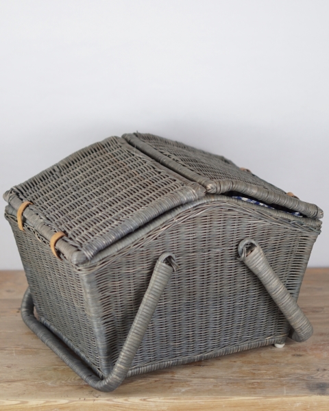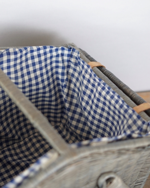 Duży piknikowy kosz wykonany z wikliny w kolorze szaro – niebieskim. Klapki zamocowane są na skórzanych paskach. Wewnątrz znajduje się kraciasta podszewka. Jest przymocowana za pomocą rzepów więc można ją wyjmować do prania. Koszyk posiada jedną, dużą komorę bez przegród. Używany, w bardzo ładnym stanie.