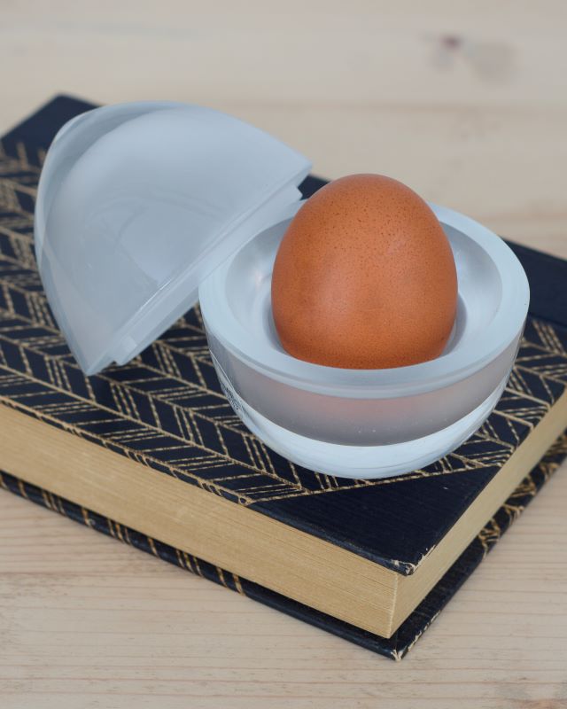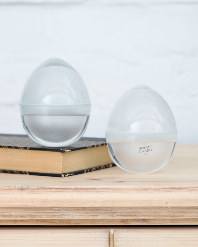 Podstawki do jajek duńskiej marki Holmegaard. Wykonane z grubego, ciężkiego, szronionego wewnątrz szkła. Projekt Michael Bang, seria Go morgen (Dzień dobry).