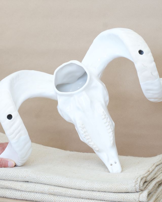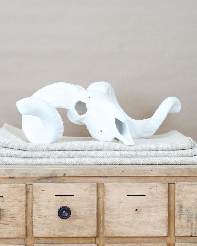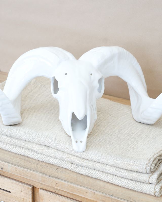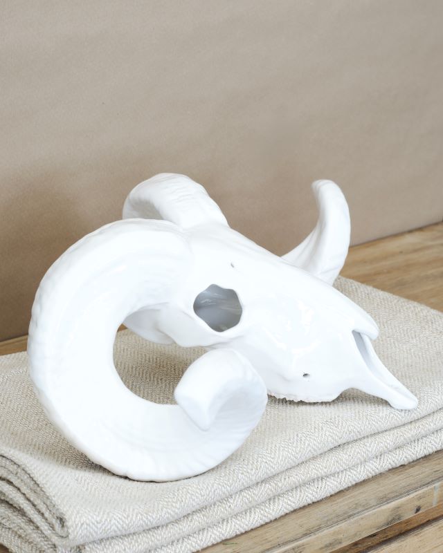 Porcelanowa dekoracja w postaci czaszki muflona. Posiada dwa otwory do zawieszenia. Stan idealny.