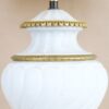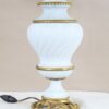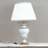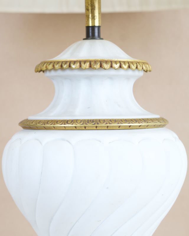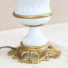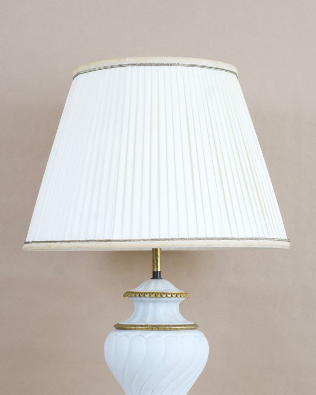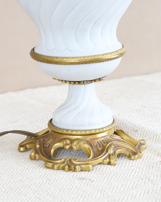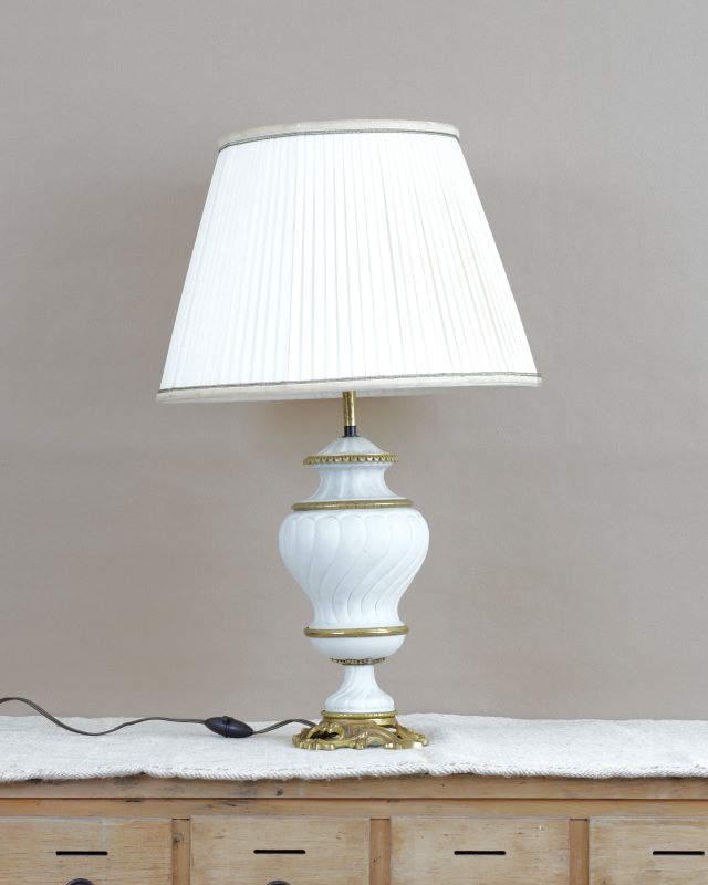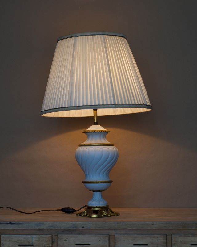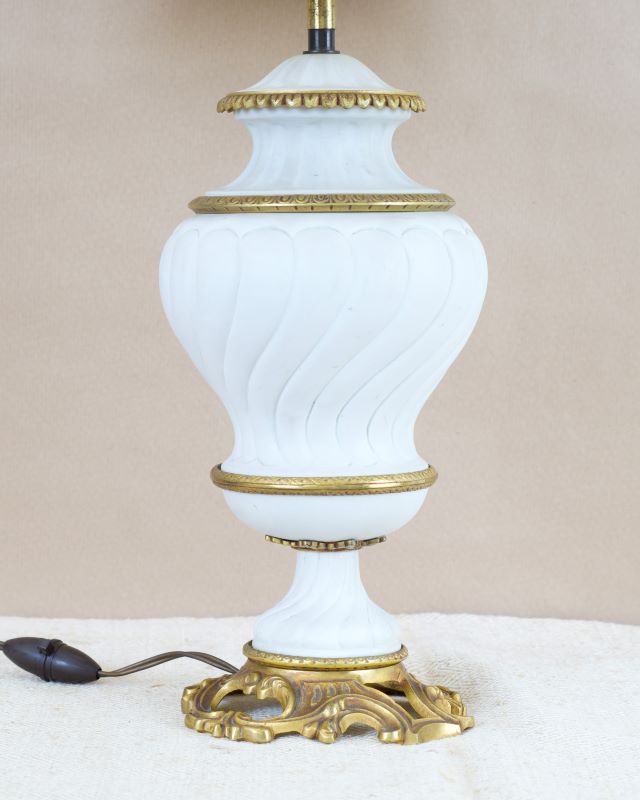 Francuska lampka stołowa wykonana z porcelany biskwitowej i mosiądzu. Zachowała się w bardzo ładnym stanie. Instalacja oryginalna, sprawna. Wtyczka będzie pasowała do nowych gniazdek. Do lampki pasuje żarówka z dużym gwintem angielskim, który bez problemu kupicie w internecie.