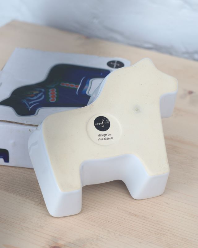 Porcelanowa miseczka w kształcie konika z Dalarny wykonana przez szwedzką markę Sagaform. Design Ylva Olsson. Miseczka jest w bardzo ładnym stanie. Idealna na drobne przekąski typu oliwki. Zachowało się też oryginalne pudełko chociaż czasy świetności ma już za sobą.