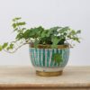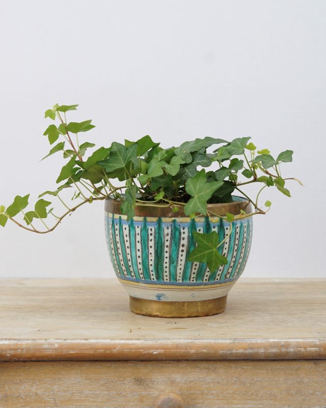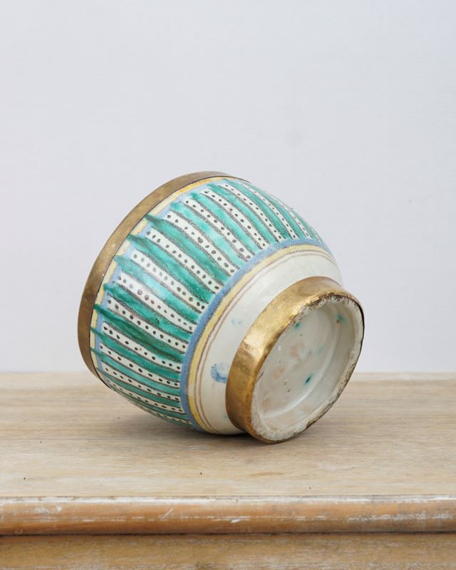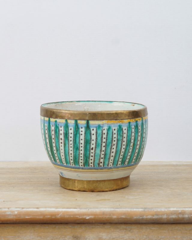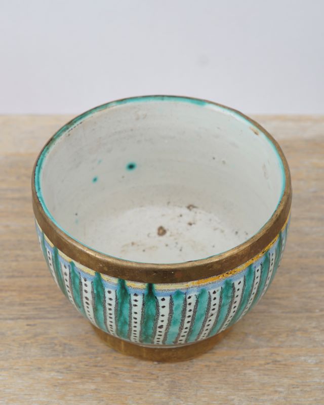 Skandynawska osłonka ceramiczna z krawędziami ozdobionymi mosiężnymi paskami. Hand made, stan bardzo dobry.
