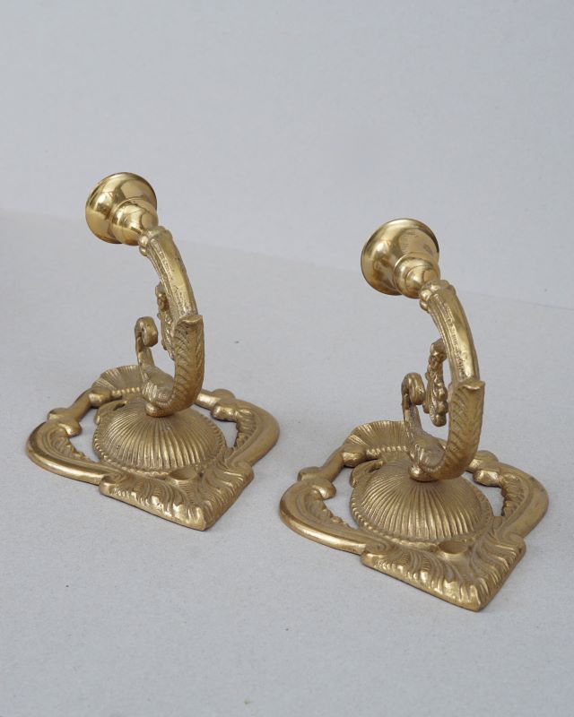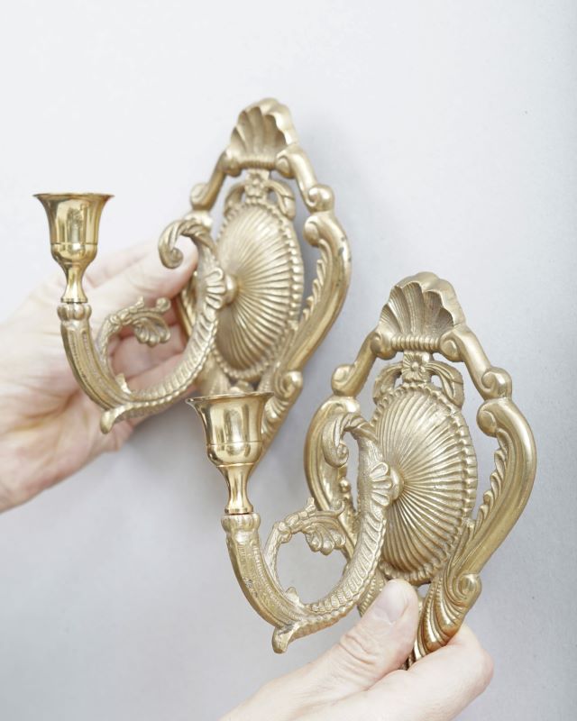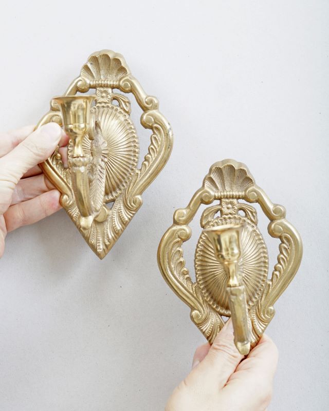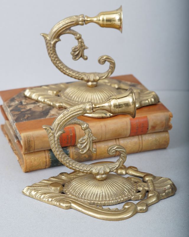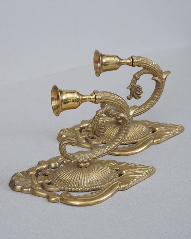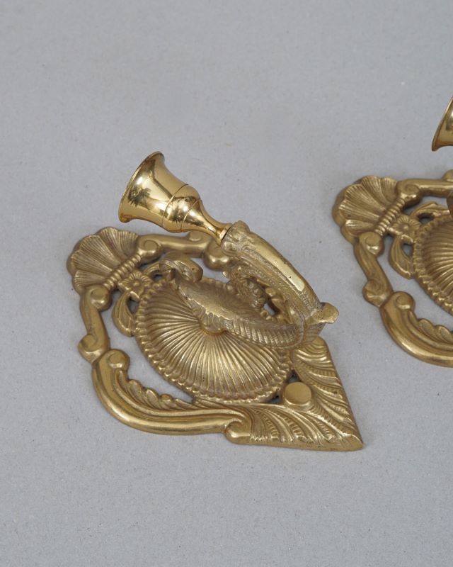 Świeczniki mosiężne w formie kinkietów do zawieszenia na ścianie. Stan bardzo dobry. Sprzedajemy tylko komplet.