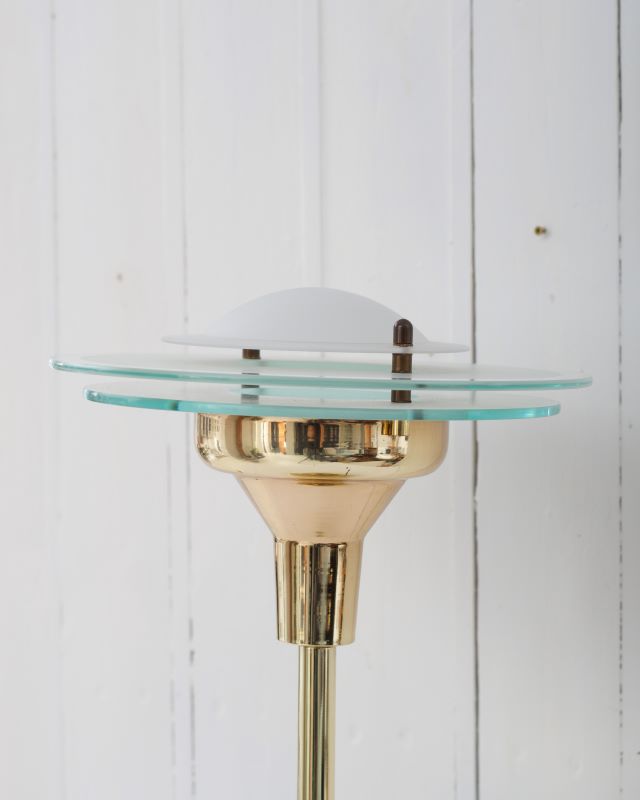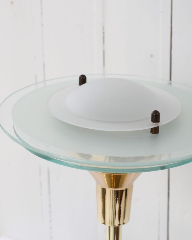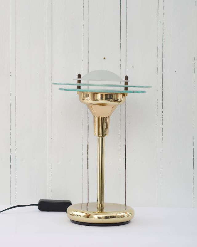 Włoska lampka stołowa w stylu Art Deco. Wykonana przez firmę RELCO z Mediolanu w latach 80 – tych. Podstawa i trzon są z mosiądzu, góra lampy składa się z trzech szklanych dysków ułożonych stożkowo. Jest to lampka halogenowa. Na kablu znajduje się wyłącznik oraz regulacja natężenia światła. Lampka zachowała się w bardzo ładnym stanie vintage.
